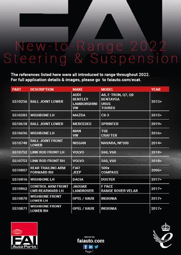 16 Get The Download! Missed any of these Weekly Recommended? - Click to Download FAI Focus January 2023 WEEKLY RECOMMENDED faiauto.com WN0123 06/01/2023 HUB BEARING KIT Front Axle Mainly Fitted To: 2012> AUDI: A3, Q2, Q3, TT SEAT: ATECA, LEON, TARRACO SKODA: KAROQ, KODIAQ, OCTAVIA, SUPERB VW: ARTEON, GOLF, ID.3, PASSAT, T-ROC OE Ref. 8V0498625A LINK STABILISER Front Axle Left and Right Mainly Fitted To: ALFA ROMEO: GIULIETTA, MITO 2008-2020 FIAT: 500L, GRAND PUNTO, PUNTO 2005> OPEL/VAUX: CORSA 2006-2014 LINK STABILISER Front Axle Left and Right Mainly Fitted To: NISSAN: KUBISTAR 2003> RENAULT: CLIO, KANGOO, MEGANE 1996> OE Ref. 55700753 TRACK CONTROL ARM Front Axle Left & Right Mainly Fitted To: CITROEN: JUMPY 2007-2016 FIAT: SCUDO 2007-2016 PEUGEOT: EXPERT 2007> TOYOTA: PROACE 2013-2016 OE Ref. 5461600QAA Popular OE Ref. 1401239580 & 1401239480 Popular Popular Popular WN0123