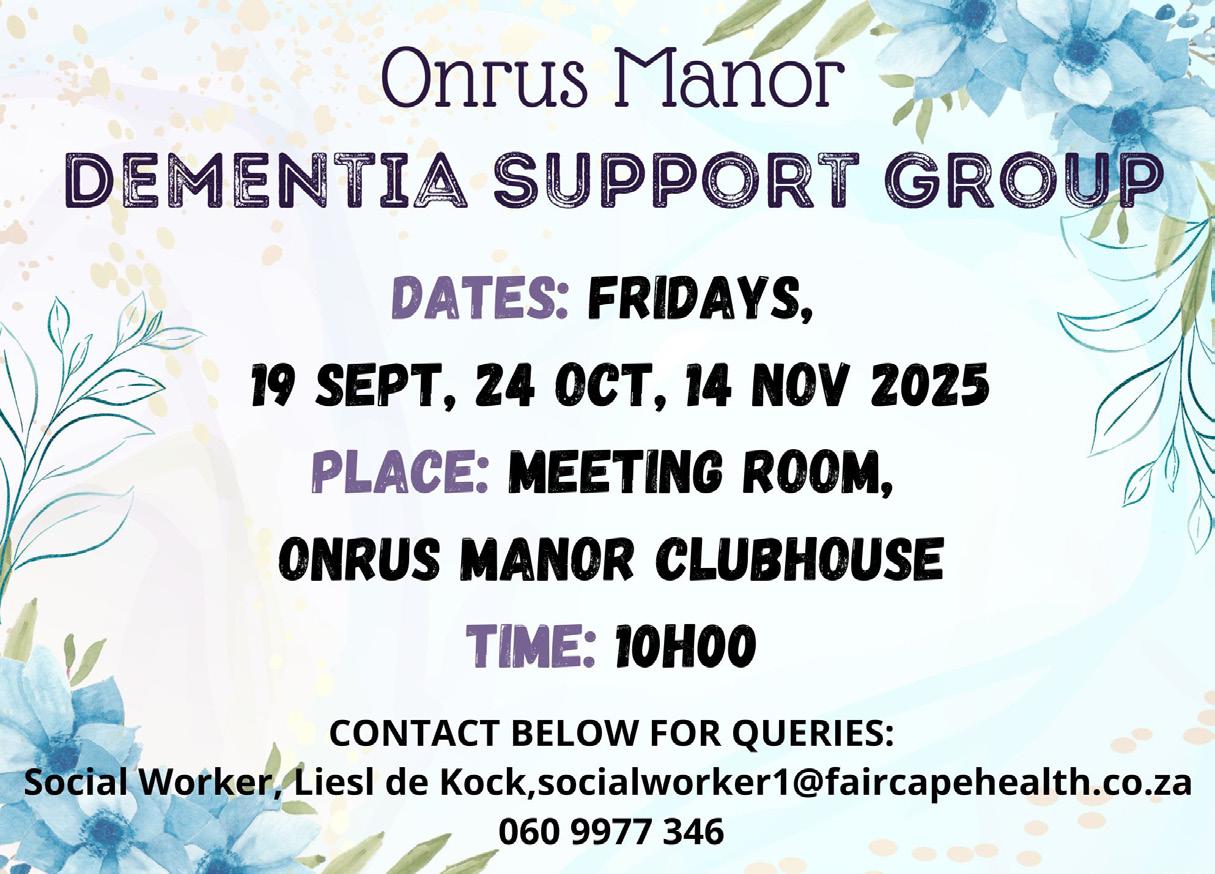 The purpose of the Dementia Support Group is to create a safe space where spouses and family of persons living with dementia (PLWD) can share their experiences in a supportive, non-judgemental and caring environment. The group is facilitated by Occupational Therapist Marijke Scrooby and Social Worker, Liesl de Kock.