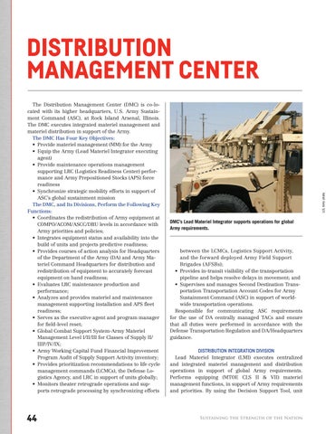 The Distribution Management Center (DMC) is co-located with its higher headquarters, U.S. Army Sustainment Command (ASC), at Rock Island Arsenal, Illinois. The DMC executes integrated materiel management and materiel distribution in support of the Army. The DMC Has Four Key Objectives: • Provide materiel management (MM) for the Army • Equip the Army (Lead Materiel Integrator executing agent) • Provide maintenance operations management supporting LRC (Logistics Readiness Center) performance and Army Prepositioned Stocks (APS) force readiness • Synchronize strategic mobility efforts in support of ASC’s global sustainment mission The DMC, and Its Divisions, Perform the Following Key Functions: • Coordinates the redistribution of Army equipment at COMPO/ACOM/ASCC/DRU levels in accordance with Army priorities and policies; • Integrates equipment status and availability into the build of units and projects predictive readiness; • Provides courses of action analysis for Headquarters of the Department of the Army (DA) and Army Materiel Command Headquarters for distribution and redistribution of equipment to accurately forecast equipment on hand readiness; • Evaluates LRC maintenance production and performance; • Analyzes and provides materiel and maintenance management supporting installation and APS fleet readiness; • Serves as the executive agent and program manager for field-level reset; • Global Combat Support System-Army Materiel Management Level I/II/III for Classes of Supply II/ IIIP/IV/IX; • Army Working Capital Fund Financial Improvement Program Audit of Supply Support Activity inventory; • Provides prioritization recommendations to life cycle management commands (LCMCs), the Defense Logistics Agency, and LRC in support of units globally; • Monitors theater retrograde operations and supports retrograde processing by synchronizing efforts