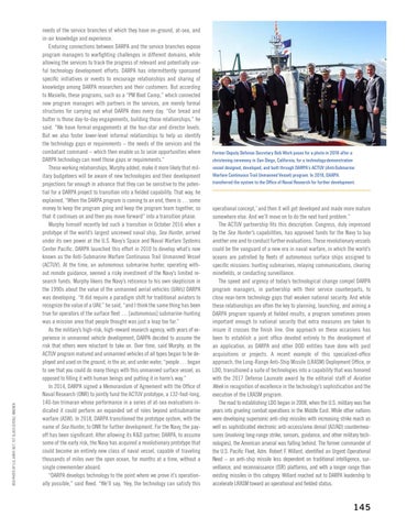 needs of the service branches of which they have on-ground, at-sea, and in-air knowledge and experience. Enduring connections between DARPA and the service branches expose program managers to warfighting challenges in different domains, while allowing the services to track the progress of relevant and potentially useful technology development efforts. DARPA has intermittently sponsored specific initiatives or events to encourage relationships and sharing of knowledge among DARPA researchers and their customers. But according to Masiello, these programs, such as a “PM Boot Camp,” which connected new program managers with partners in the services, are merely formal structures for carrying out what DARPA does every day. “Our bread and butter is those day-to-day engagements, building those relationships,” he said. “We have formal engagements at the four-star and director levels. But we also foster lower-level informal relationships to help us identify the technology gaps or requirements – the needs of the services and the combatant command – which then enable us to seize opportunities where DARPA technology can meet those gaps or requirements.” These working relationships, Murphy added, make it more likely that military budgeteers will be aware of new technologies and their development projections far enough in advance that they can be sensitive to the potential for a DARPA project to transition into a fielded capability. That way, he explained, “When the DARPA program is coming to an end, there is … some money to keep the program going and keep the program team together, so that it continues on and then you move forward” into a transition phase. Murphy himself recently led such a transition in October 2016 when a prototype of the world’s largest uncrewed naval ship, Sea Hunter, arrived under its own power at the U.S. Navy’s Space and Naval Warfare Systems Center Pacific. DARPA launched this effort in 2010 to develop what’s now known as the Anti-Submarine Warfare Continuous Trail Unmanned Vessel (ACTUV). At the time, an autonomous submarine hunter, operating without remote guidance, seemed a risky investment of the Navy’s limited research funds. Murphy likens the Navy’s reticence to his own skepticism in the 1990s about the value of the unmanned aerial vehicles (UAVs) DARPA was developing. “It did require a paradigm shift for traditional aviators to recognize the value of a UAV,” he said, “and I think the same thing has been true for operators of the surface fleet … [autonomous] submarine-hunting was a mission area that people thought was just a leap too far.” As the military’s high-risk, high-reward research agency, with years of experience in unmanned vehicle development, DARPA decided to assume the risk that others were reluctant to take on. Over time, said Murphy, as the ACTUV program matured and unmanned vehicles of all types began to be deployed and used on the ground, in the air, and under water, “people . . . began to see that you could do many things with this unmanned surface vessel, as opposed to filling it with human beings and putting it in harm’s way.” In 2014, DARPA signed a Memorandum of Agreement with the Office of Naval Research (ONR) to jointly fund the ACTUV prototype, a 132-foot-long, 140-ton trimaran whose performance in a series of at-sea evaluations indicated it could perform an expanded set of roles beyond antisubmarine warfare (ASW). In 2018, DARPA transitioned the prototype system, with the name of Sea Hunter, to ONR for further development. For the Navy, the payoff has been significant: After allowing its R&D partner, DARPA, to assume some of the early risk, the Navy has acquired a revolutionary prototype that could become an entirely new class of naval vessel, capable of traveling thousands of miles over the open ocean, for months at a time, without a single crewmember aboard. “DARPA develops technology to the point where we prove it’s operationally possible,” said Reed. “We’ll say, ‘Hey, the technology can satisfy this