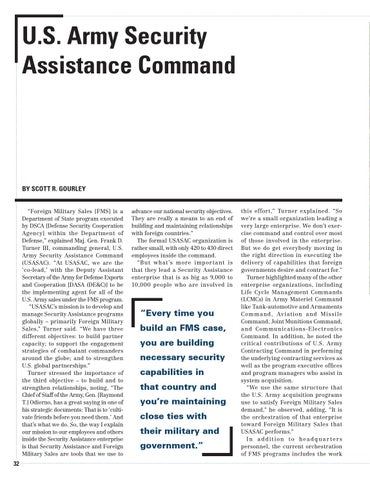 By scott r. gourley âForeign Military Sales [FMS] is a Department of State program executed by DSCA [Defense Security Cooperation Agency] within the Department of Defense,â explained Maj. Gen. Frank D. Turner III, commanding general, U.S. Army Security Assistance Command (USASAC). âAt USASAC, we are the âco-lead,â with the Deputy Assistant Secretary of the Army for Defense Exports and Cooperation [DASA (DE&C)] to be the implementing agent for all of the U.S. Army sales under the FMS program. âUSASACâs mission is to develop and manage Security Assistance programs globally â primarily Foreign Military Sales,â Turner said. âWe have three different objectives: to build partner capacity; to support the engagement strategies of combatant commanders around the globe; and to strengthen U.S. global partnerships.â Turner stressed the importance of the third objective â to build and to strengthen relationships, noting, âThe Chief of Staff of the Army, Gen. [Raymond T.] Odierno, has a great saying in one of his strategic documents: That is to âcultivate friends before you need them.â And thatâs what we do. So, the way I explain our mission to our employees and others inside the Security Assistance enterprise is that Security Assistance and Foreign Military Sales are tools that we use to