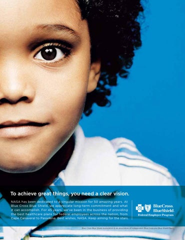 To achieve great things, you need a clear vision. NASA has been dedicated to a singular mission for 50 amazing years. At Blue Cross Blue Shield, we appreciate long-term commitment and what it can accomplish. For 45 years, we’ve been in the business of providing the best healthcare plans for federal employees across the nation, from Cape Canaveral to Pasadena. Best wishes, NASA. Keep aiming for the stars.