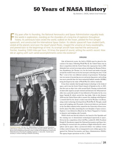 ifty years after its founding, the National Aeronautics and Space Administration arguably leads the world in exploration, standing on the shoulders of a long line of explorers throughout history. Its astronauts have circled the world, walked on the moon, piloted the first winged spacecraft, and constructed the International Space Station. Its robotic spacecraft have studied Earth, visited all the planets (and soon the dwarf planet Pluto), imaged the universe at many wavelengths, and peered back to the beginnings of time. Its scramjet aircraft have reached the aeronautical frontier, traveling 7,000 miles per hour, 10 times the speed of sound, setting the world’s record. How did an agency with such varied accomplishments come into existence?
