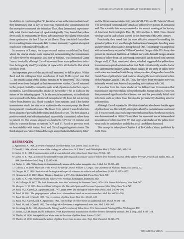 REFERENCES 2. Agramonte, A. 1928. A review of research in yellow fever. Ann. Intern. Med. 2:138–154. 7. Carroll, J. 1904. A brief review of the etiology of yellow fever. N.Y. Med. J. and Philadelphia Med. J. 79:241–245, 302–310. 8. Carter, H. R. 1898. Communication with a town infected with yellow fever. Med. News 72:546–547. 9. Carter, H. R. 1900. A note on the interval between infecting and secondary cases of yellow fever from the records of the yellow fever at Orwood and Taylor, Miss., in 1898. New Orleans Med. Surg. J. 52:617–636. 14. Finlay, C. 1886. Yellow fever: its transmission by means of the culex mosquito. Am. J. Med. Sci. 92:395–409. 17. Gibson, J. M. 1950. Physician to the World: the Life of General William C. Gorgas. The University of Alabama Press, Tuscaloosa, AL. 18. Gorgas, W. C. 1909. Sanitation of the tropics with special reference to malaria and yellow fever. JAMA 52:1075–1077. 19. Hemmeter, J. C. 1927. Master Minds in Medicine, p. 297–336. Medical Life Press, New York, NY. 21. Kelly, H. A. 1923. Walter Reed and Yellow Fever. Norman, Remington, Baltimore, MD. 25. McCullough, D. 1977. The Path between the Seas: the Creation of the Panama Canal, 1870–1914. Simon & Schuster, New York, NY. 26. Morgan, H. W. 1965. America’s Road to Empire: the War with Spain and Overseas Expansion. John Wiley, New York, NY. 29. Reed, W., J. Carroll, A. Agramonte, and J. W. Lazear. 1900. The etiology of yellow fever. Phila. Med. J. 6:790–796. 30. Reed, W. 1901. The propagation of yellow fever; observations based on recent researches. Med. Rec. 60:201–209. 31. Reed, W., and J. Carroll. 1901. The prevention of yellow fever. Med. Rec. 60:641–649. 32. Reed, W., J. Carroll, and A. Agramonte. 1901. The etiology of yellow fever: an additional note. JAMA 36:431–440. 33. Reed, W., and J. Carroll. 1902. The etiology of yellow fever: a supplemental note. Am. Med. 3:301–305. 36. Sternberg, G. M. 1890. Report on the Etiology and Prevention of Yellow Fever. U.S. Government Printing Office, Washington, DC. 37. Stokes, A., J. H. Bauer, and N. P. Hudson. 1928. Experimental transmission of yellow fever to laboratory animals. Am. J. Trop. Med. 8:103–164. 38. Theiler, M. 1930. Susceptibility of white mice to the virus of yellow fever. Science 71:367. 39. Theiler, M. 1930. Studies on the action of yellow fever virus in mice. Ann. Trop. Med. Parasitol. 24:249–272.