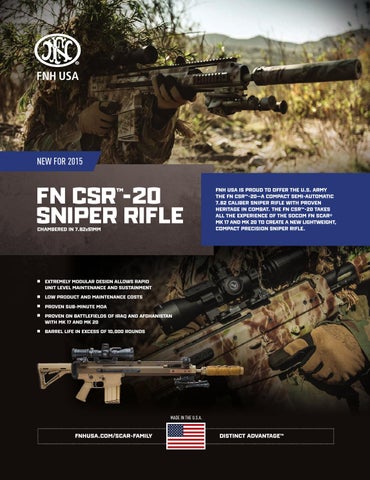 FNH USA IS PROUD TO OFFER THE U.S. ARMY THE FN CSR™-20—A COMPACT SEMI-AUTOMATIC 7.62 CALIBER SNIPER RIFLE WITH PROVEN HERITAGE IN COMBAT. THE FN CSR™-20 TAKES ALL THE EXPERIENCE OF THE SOCOM FN SCAR® MK 17 AND MK 20 TO CREATE A NEW LIGHTWEIGHT, COMPACT PRECISION SNIPER RIFLE.