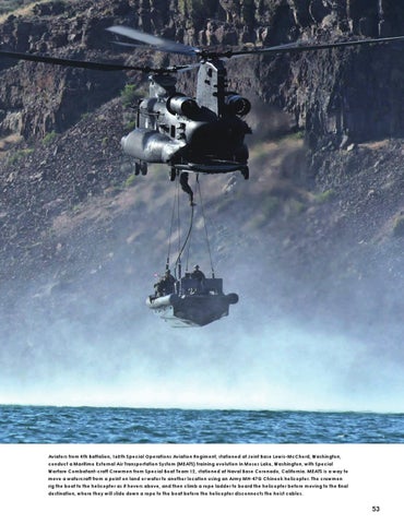Aviators from 4th Battalion, 160th Special Operations Aviation Regiment, stationed at Joint Base Lewis-McChord, Washington, conduct a Maritime External Air Transportation System (MEATS) training evolution in Moses Lake, Washington, with Special Warfare Combatant-craft Crewmen from Special Boat Team 12, stationed at Naval Base Coronado, California. MEATS is a way to move a watercraft from a point on land or water to another location using an Army MH-47G Chinook helicopter. The crewmen rig the boat to the helicopter as it hovers above, and then climb a rope ladder to board the helicopter before moving to the final destination, where they will slide down a rope to the boat before the helicopter disconnects the hoist cables.