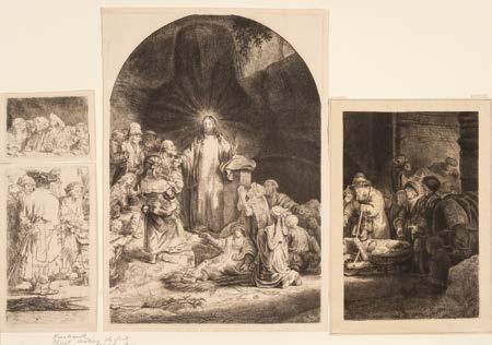 Other reprintings involved more significant changes to the composition. Rembrandt’s copper plates remained in circulation for more than a century after his death, as posthumous printings helped satisfy the ever-growing demand for his work among collectors in northern Europe and England. It was not uncommon for these plates to be reworked to reinforce the lines of Rembrandt’s designs, which could not hold up to large numbers of impressions being pulled from them, particularly the drypoints. In 1775, the English collector and amateur artist Captain William Baillie purchased the plate for the Hundred Guilder Print , one of Rembrandt’s most successful compositions, from a painter named John Greenwood. Baillie “restored” the plate, significantly reworking it in the process, and printed a new edition of 100 impressions. Later, Baillie took things a step further, cutting the reworked plate into four sections, each of which could be printed and sold individually, as seen here, with the four pieces reassembled. (cat. 35, facing page).