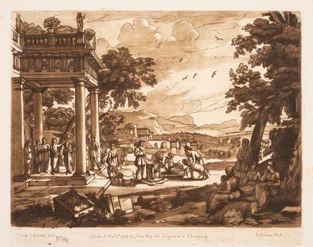 In the case of Saul Anointing David (cat. 46, p. 18) the inscription includes even the month and date of its publication, as well as the neighborhood of the publisher: Claude le Lorrain delin[eavit] / No. 69 / Published Nov[embe]r 1st 1774 by John Boydell Engraver in Cheapside / R Earlom fecit . This print formed part of a remarkably ambitious project known as the Liber Veritatis , which sought to capitalize on the 18th-century English taste for the romantic paintings of the 17th-century painter Claude Lorrain. Boydell, the publisher, commissioned Richard Earlom to reproduce an album of 200 pen and wash drawings that Claude had used to record his own paintings (the album having entered England earlier in the century in the collection of the Duke of Devonshire).