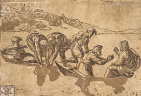 Both woodblocks and intaglio plates were typically used to produce prints until they came too worn down or damaged to produce a good impression. Even then, enterprising publishers might have a block re-carved, or intaglio lines reinforced, to protect their stockin-trade. For example, when the publisher Andrea Andreani reprinted a chiaroscuro woodcut after Raphael’s The Miraculous Draft of Fishes (cat. 24, above) he inserted a new signature block at lower left (fig. 2, below) that gave his own monogram, the city of Mantua, and the date of 1609. While Raphael was still given pride of place as the “inventor,” the name of the original 16th-century printmaker Niccolò Vicentino was omitted.