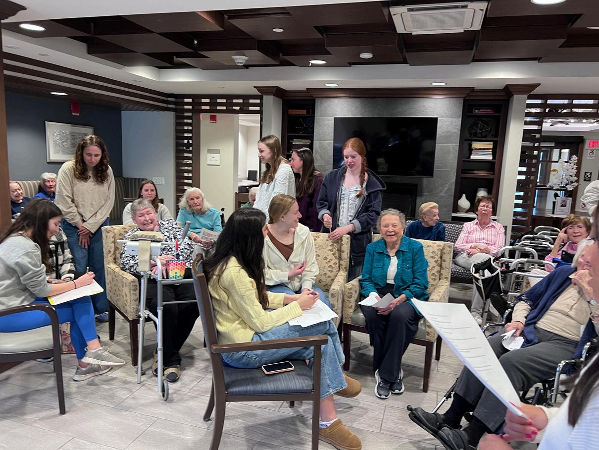 Student volunteers at the Sturges Ridge senior living community led chair yoga, painted nails, and played balloon volleyball and Are You Smarter Than a College Student?