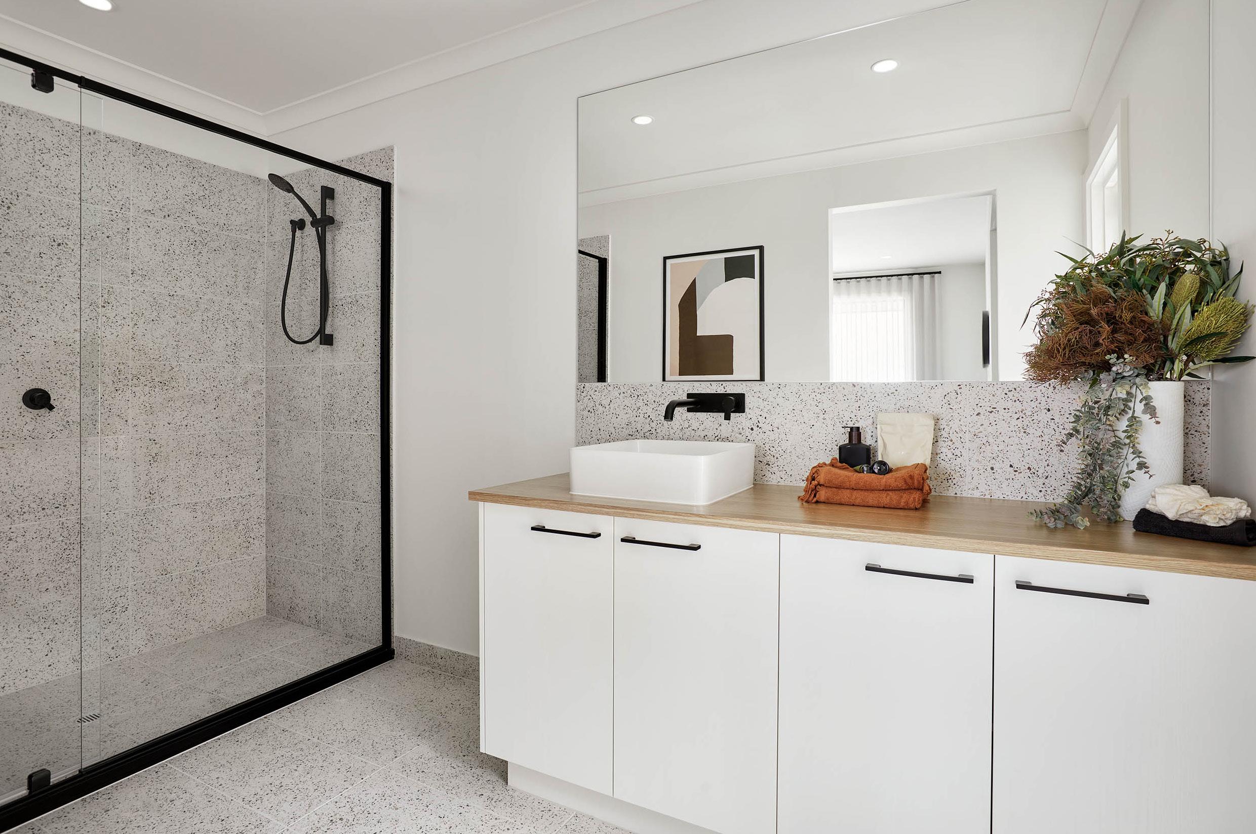 Fairhaven Homes reserves the right to change suppliers and/or products at any time as part of its continual improvement process. Any relevant changes to the included information will be advised during your colour appointment and not all products included herein will be suitable to every application. Colours represented are an indication only and may vary with the printing process. Information is correct at the time of print and subject to change without notice. Version 1 - 11/22. Family 1. Paint Manufacturer: Colour: Included Taubmans Winter Ice 2. Cornice Profile: Upgrade Square Set 1 2 Specifications Included Alternatives: 2. Cornice: 75mm Cove 5. Tiles: Warehouse White 450x450 3 3. Sliding Door Colour: Included Black 4 5 4. Skirting Make/Type: Colour: Included Corinthian Single Bevelled 67mm x 12mm 5. Tiles Manufacturer: Colour: Upgrade Beaumont Tiles Promenado White Text 300x600