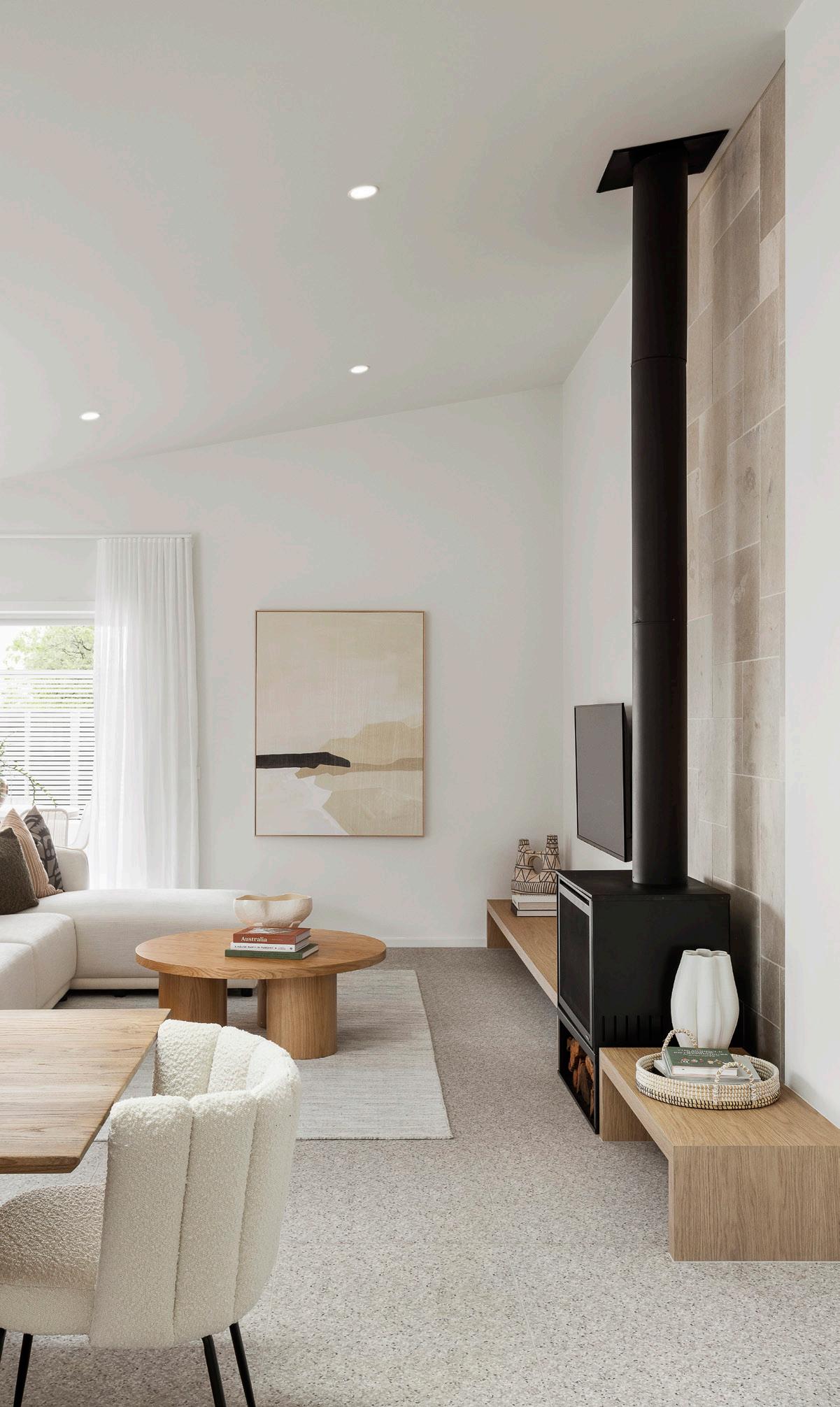Sharing the Kitchen space is the Meals and Family, raked ceiling catches your attention drawing your eye towards the prominent and ultimate gas fireplace. The matt black fireplace highlights the textural contrast of the natural stacked stone paver situated behind. White modular couch and timber furniture enhance the room. Wall hung TV filling the wall space next to the fireplace. The Meals a showstopper, showing off the space with a skylight center above the table, filling the area with natural light.