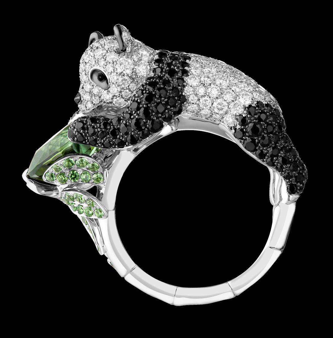 BOUCHERON, “Panda”, ring made from white gold, set with diamonds, black sapphire, tsavorite, and green tourmaline, 36,800.00 (ASP)