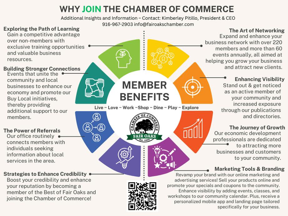 The Chamber offers an excellent opportunity to network in person and promote your business. The Chamber is always actively recruiting new members We also offer volunteer opportunities to help with our community events. Only with an interested and involved citizenship, can our destiny fulfill the dreams we all have for Fair Oaks. Visit us at: www fairoakschamber com