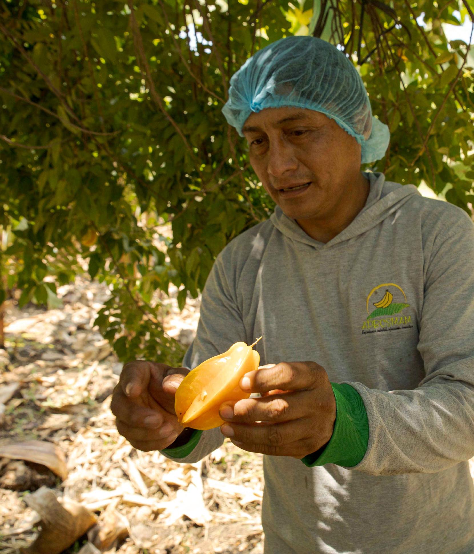 Balbino Reyes Rosales is an agronomist for Fairtrade certified banana cooperative APBOSMAM in Peru. To make their soil more pest and disease resilient, farmers plant a variety of trees and plants alongside the banana trees to boost biodiversity, such as coconut, chili peppers, oranges, mangoes and legumes. The cooperative has used its Fairtrade Premium to invest in organic fertiliser production, among other things.