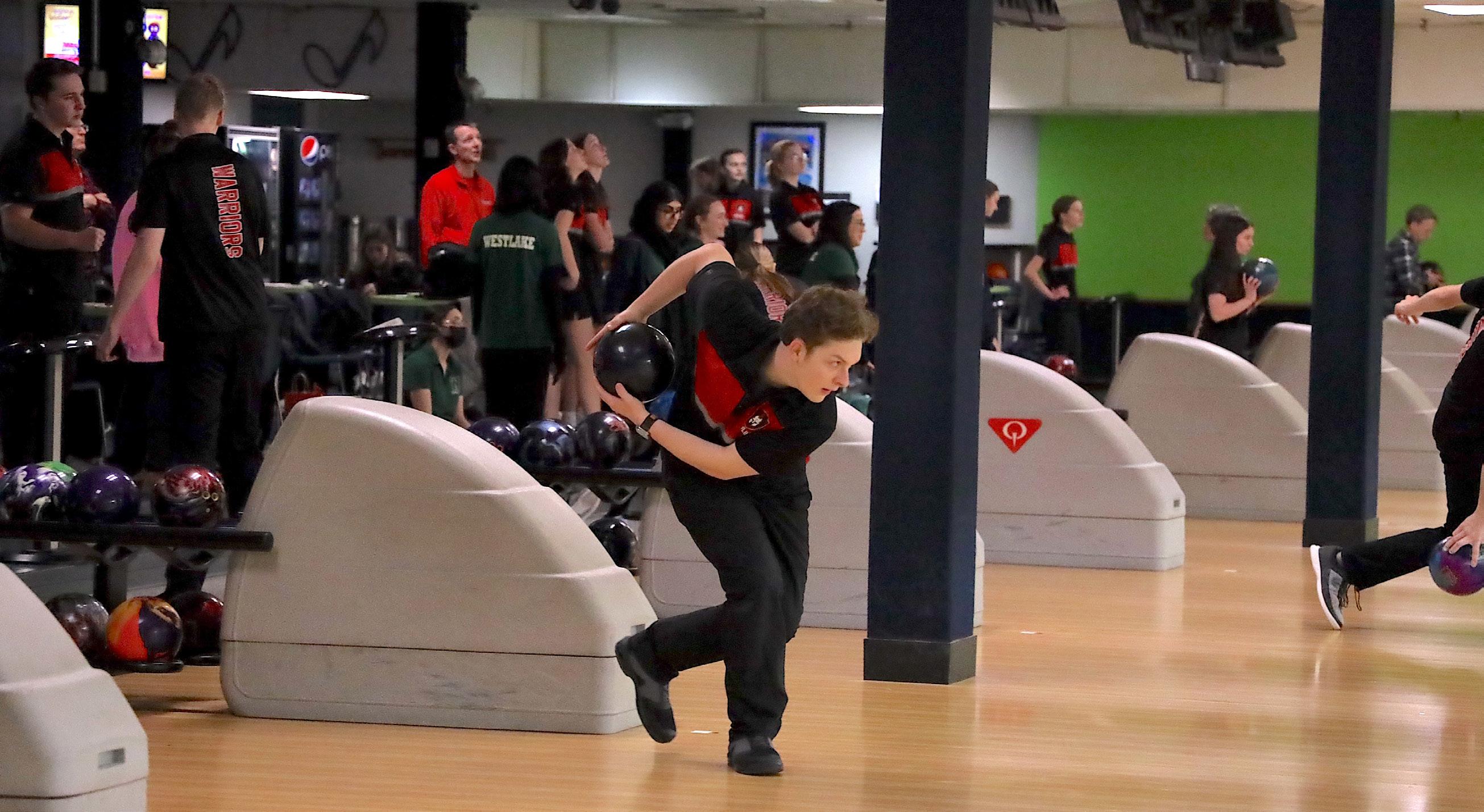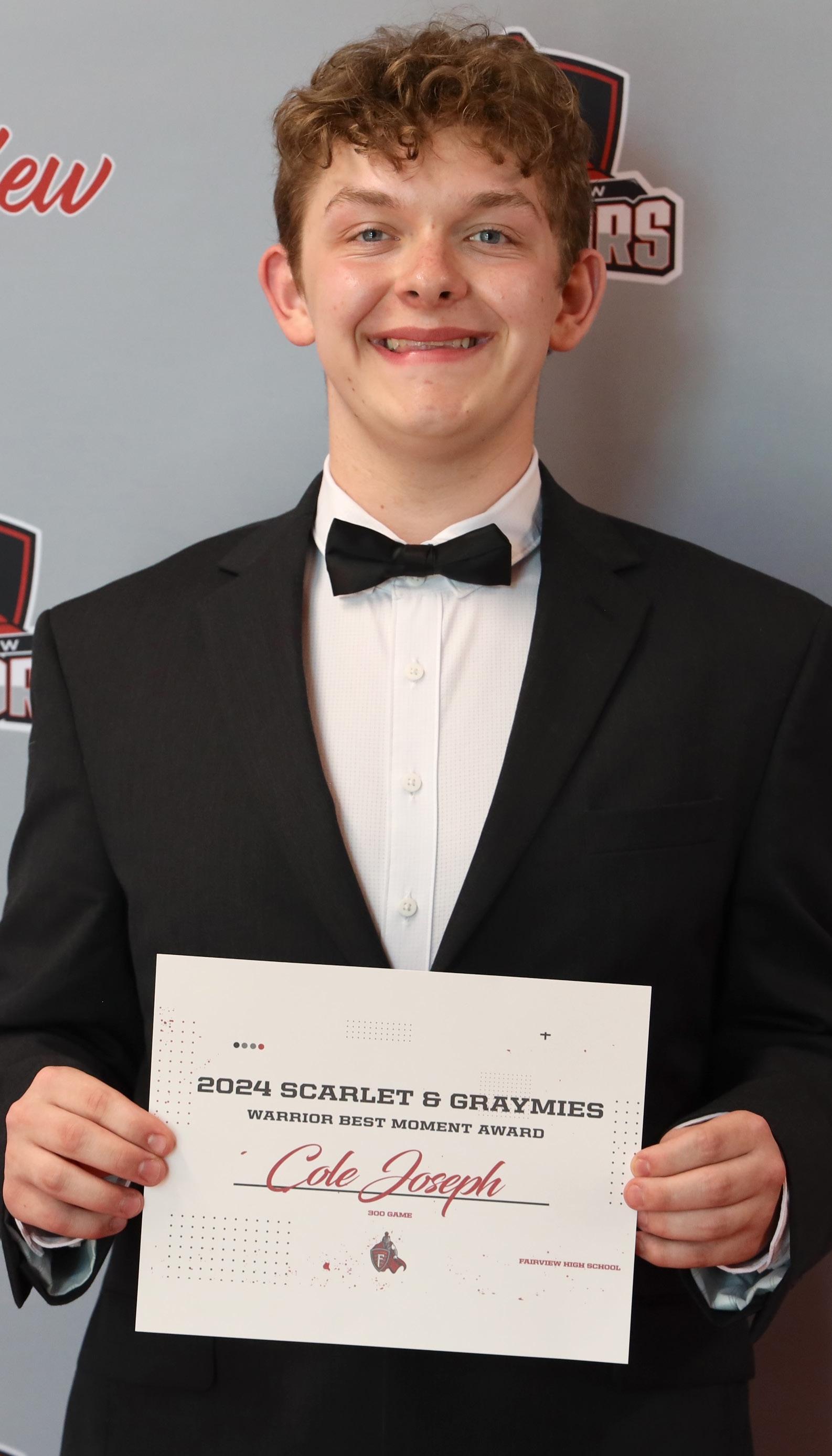 Pictured at left: Cole Joseph wins the “Best Moment Award” at the 2024 Scarlet & Graymies Athletics Award ceremony for his perfect game performance in January. Below: Joseph competes against Westlake High School at Fairview Lanes.