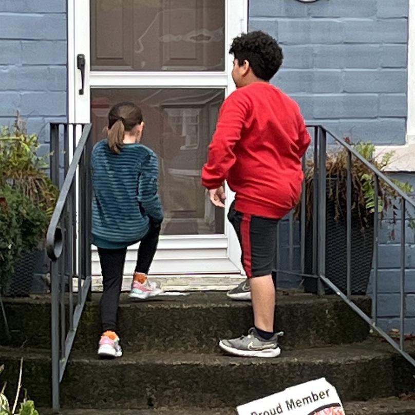 First and fourth graders collaborate on a service project, delivering handmade crafts and gratitude messages to neighbors, fostering community connections and receiving positive responses.