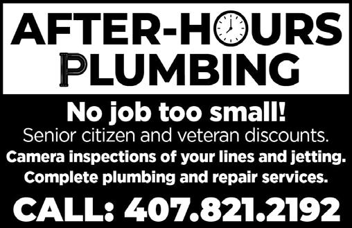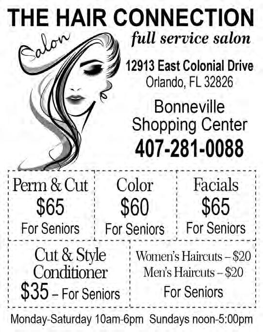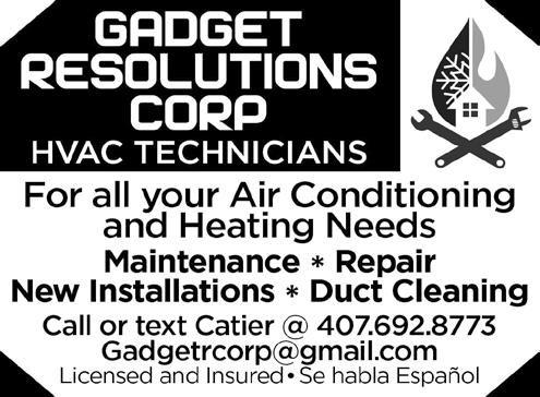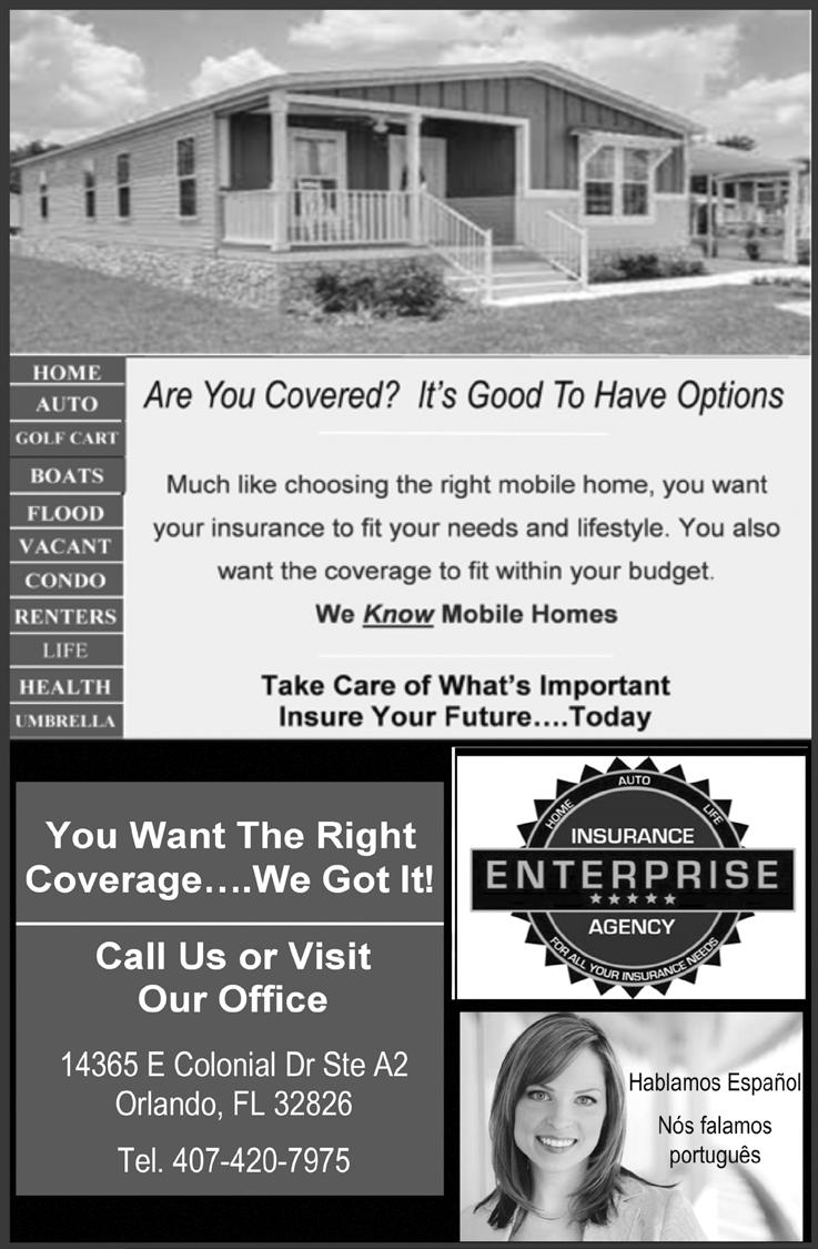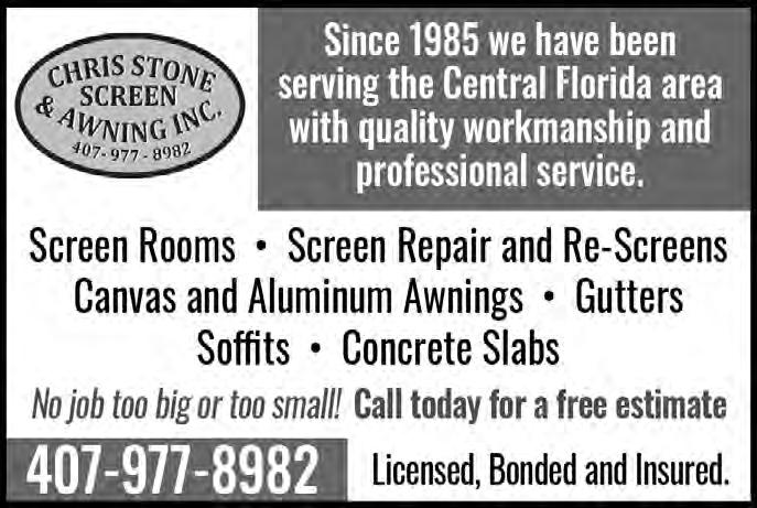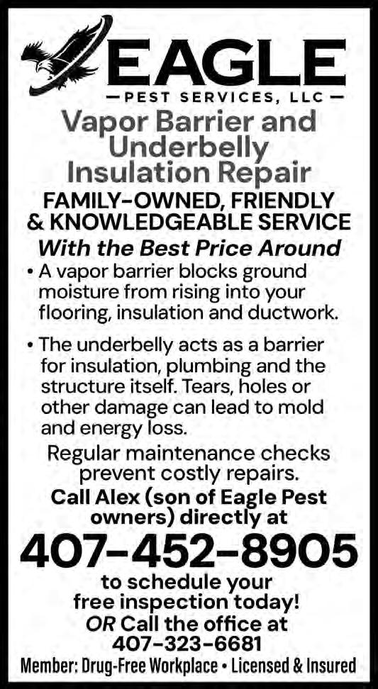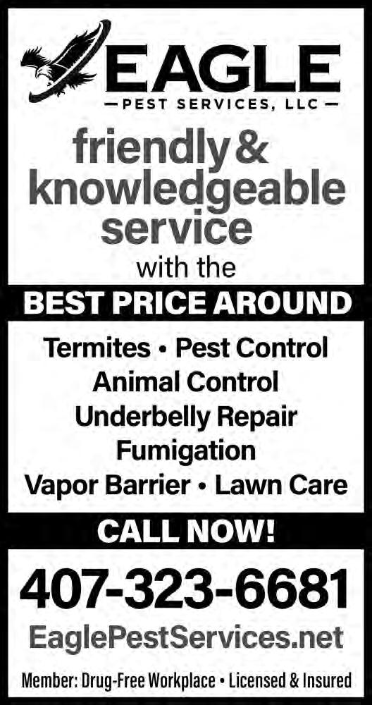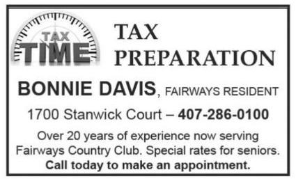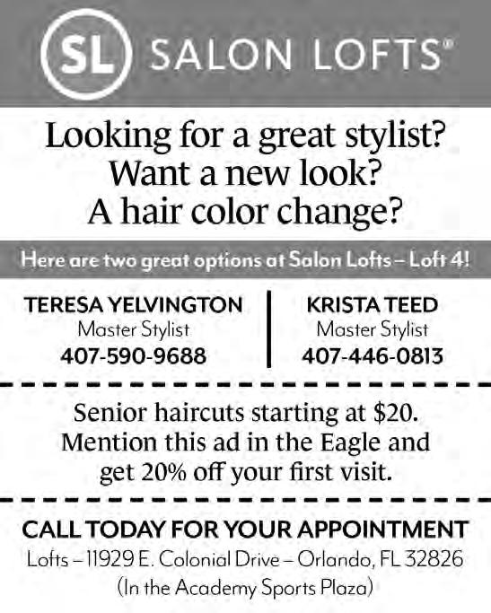 DEADLINES – • ADS: 10th of the month. • FEATURES: 15th of the month. NEWS:15th of the month ADVERTISING SALES & DESIGN – Ads can be purchased for a single or multiple issues of Eagle in a variety of size and design options by calling Lisbeth Echeandia at 407-271-7906 or by emailing lisbeth.fairwayseagle@gmail.com. • The Eagle staff does not “vet” any advertising that is included in the newspaper and inclusion should not be considered as an endorsement by the staff. We encourage all residents to research any vendor before hiring. We can design your ad for you! Just contact Lisbeth.