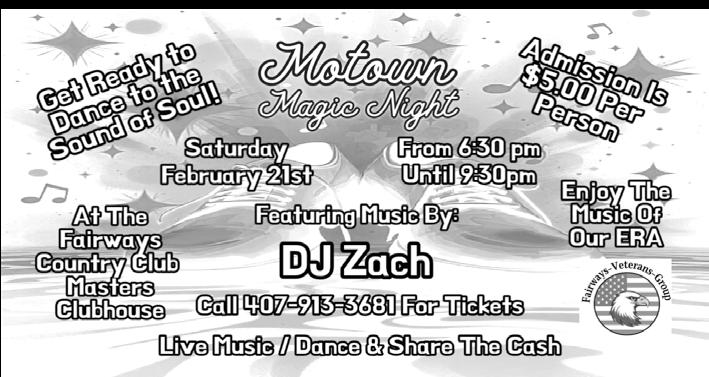 Remembering The Motown Era Plan for a trip down “Memory Lane” as on Saturday February 21st, starting at 6:30pm, we will be able to reminisce to the music of this era. At the Masters Clubhouse our DJ Zach will be providing us a night of music and entertainment. Admission is $5.00 per person and there will be raffles (“Share The Cash”). Bring your own snacks and beverages. This is a great time to let your hair down and have some fun!