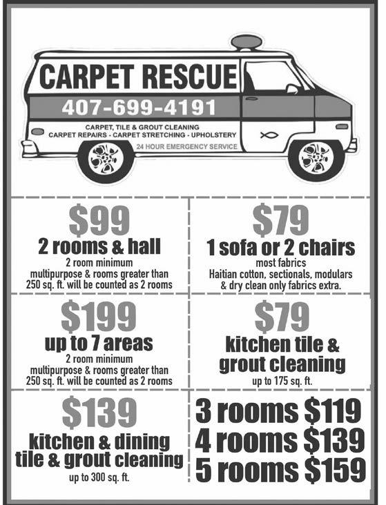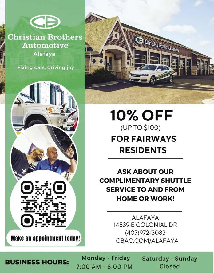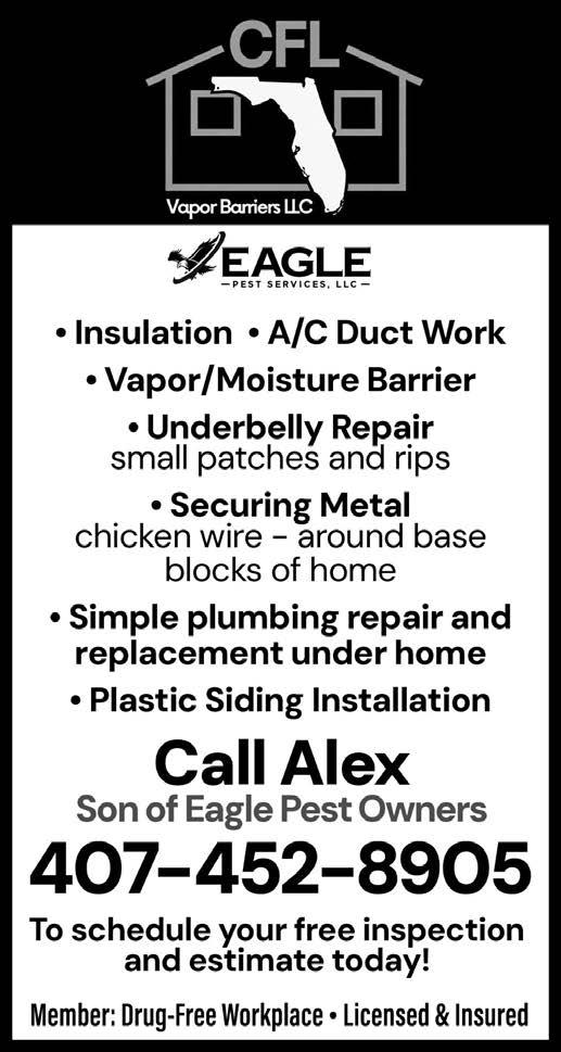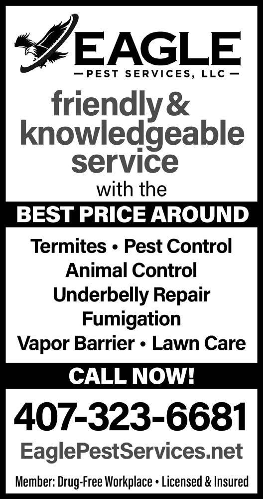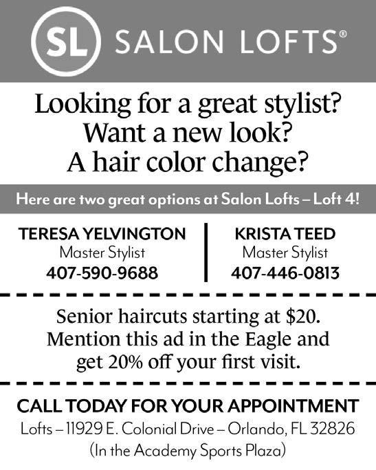 DEADLINES – • ADS: 10th of the month. • FEATURES: 15th of the month. NEWS:15th of the month ADVERTISING SALES & DESIGN – Ads can be purchased for a single or multiple issues of Eagle in a variety of size and design options by calling Lisbeth Echeandia at 407-271-7906 or by emailing lisbeth.fairwayseagle@gmail.com. • The Eagle staff does not “vet” any advertising that is included in the newspaper and inclusion should not be considered as an endorsement by the staff. We encourage all residents to research any vendor before hiring. We can design your ad for you! Just contact Lisbeth.