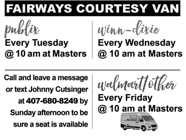 ATTENTION RIDERS: Courtesy van service is available to Hometown America Fairways residents who want to participate in adventures to area shopping centers.