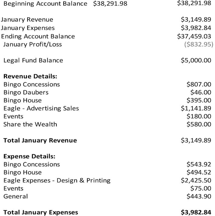 Valentine’s Bingo on February 11th clocked in with 118 players! Congratulations to James Dennis on his firstever time calling Bingo. He did a great job. Many players dressed in red as suggested, and there was a total of 24 door prizes plus Share the Wealth. Each of the ladies present received a red rose – which was much appreciated.