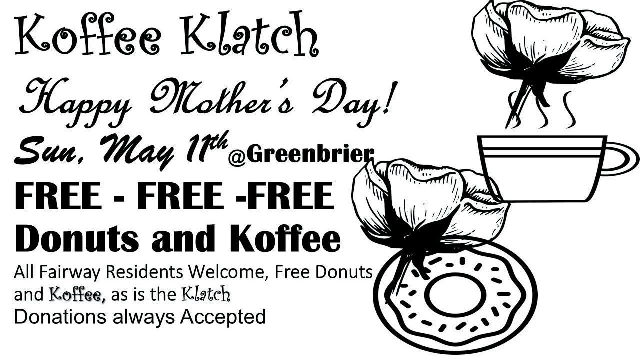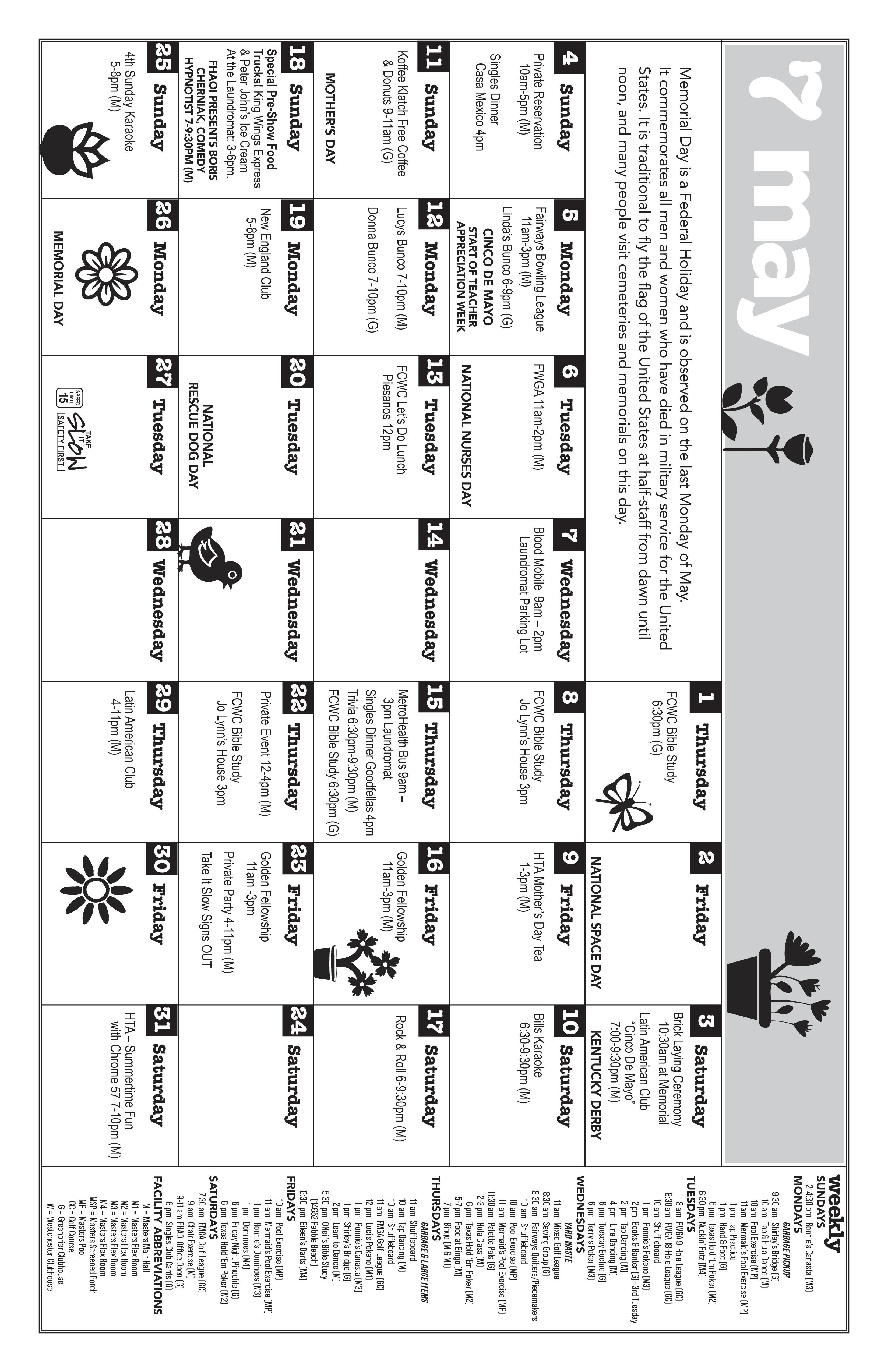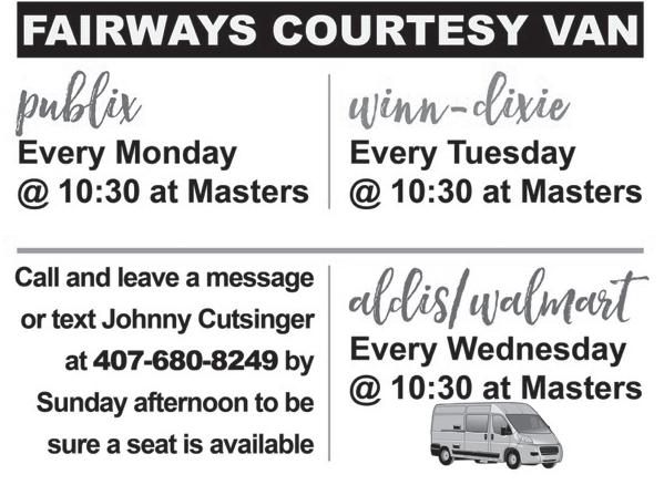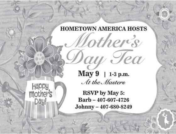 Happy Mother’s Day to all our Fairways Moms. On May 9, Hometown America will host a special Mother’s Day Tea at the Masters from 1 to 3 p.m. All moms need to do is RSVP by May 5 to either Barb at 407-607-4728 or Johnny Cutsinger at 407-680-8249.