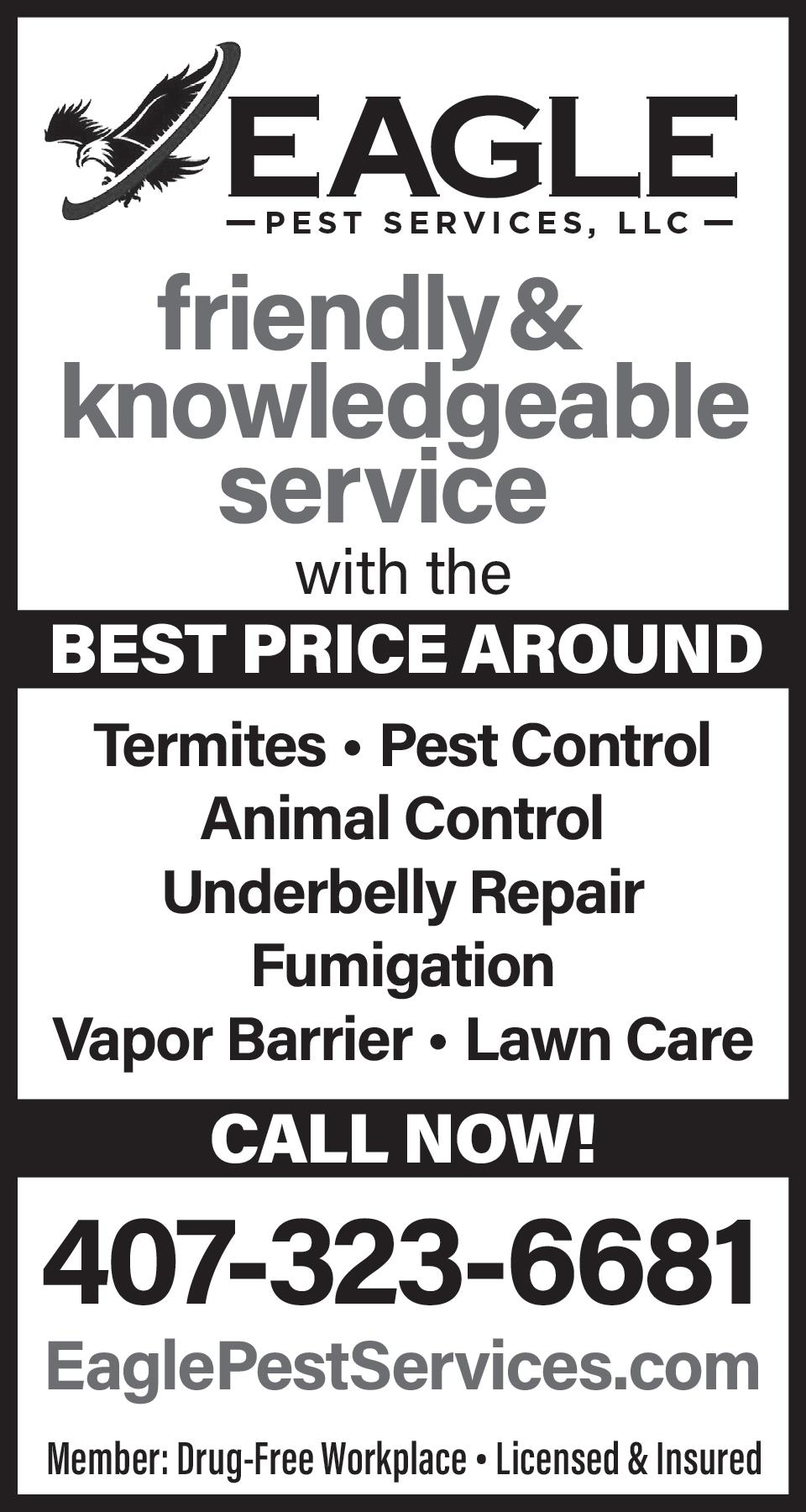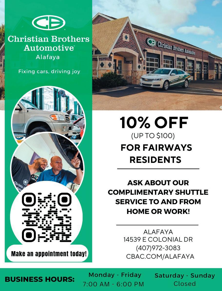 The Eagle is published by the Fairways Homeowners Association of Orlando, Inc. for the benefit of Fairways residents. • The Editor and Management Staff of Eagle newspaper reserve the right to accept, reject or edit articles, advertisements and all other community/club submissions in order to conform with the polices of this paper. Those policies are: • We do not publish anonymous opinions. Names will not be withheld. • Letters to the Editor must include the writer’s full name, signature, address and telephone number. Addresses and telephone numbers are used for validation purposes only and will not be published.• Submissions from any source become the property of the Eagle newspaper.• All submissions are subject to editing for grammatical and spelling mistakes, accuracy, clarity, civility and length.• Any submissions that express libelous, insulting or polarizing content will be rejected. DEADLINES – • ADS: 10th of the month. • FEATURES: 15th of the month. NEWS:15th of the month ADVERTISING SALES & DESIGN – Ads can be purchased for a single or multiple issues