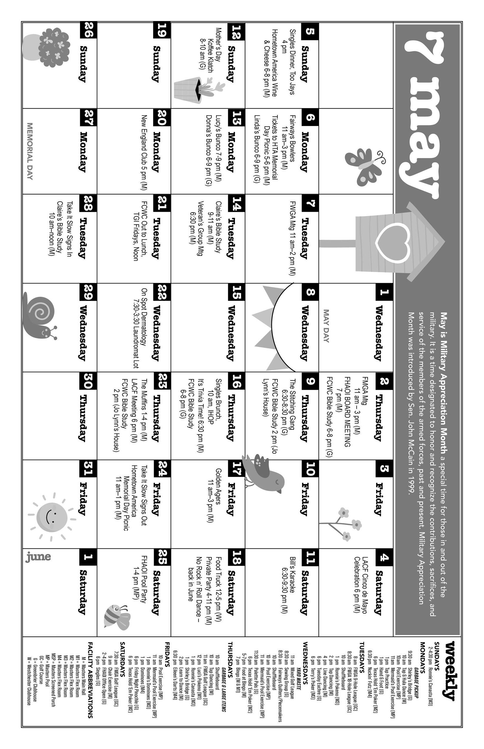 • Tuesday May 14th, Fairways Veterans Group General meeting at 6:30pm. Remember, we always welcome all Fairways residents to attend.