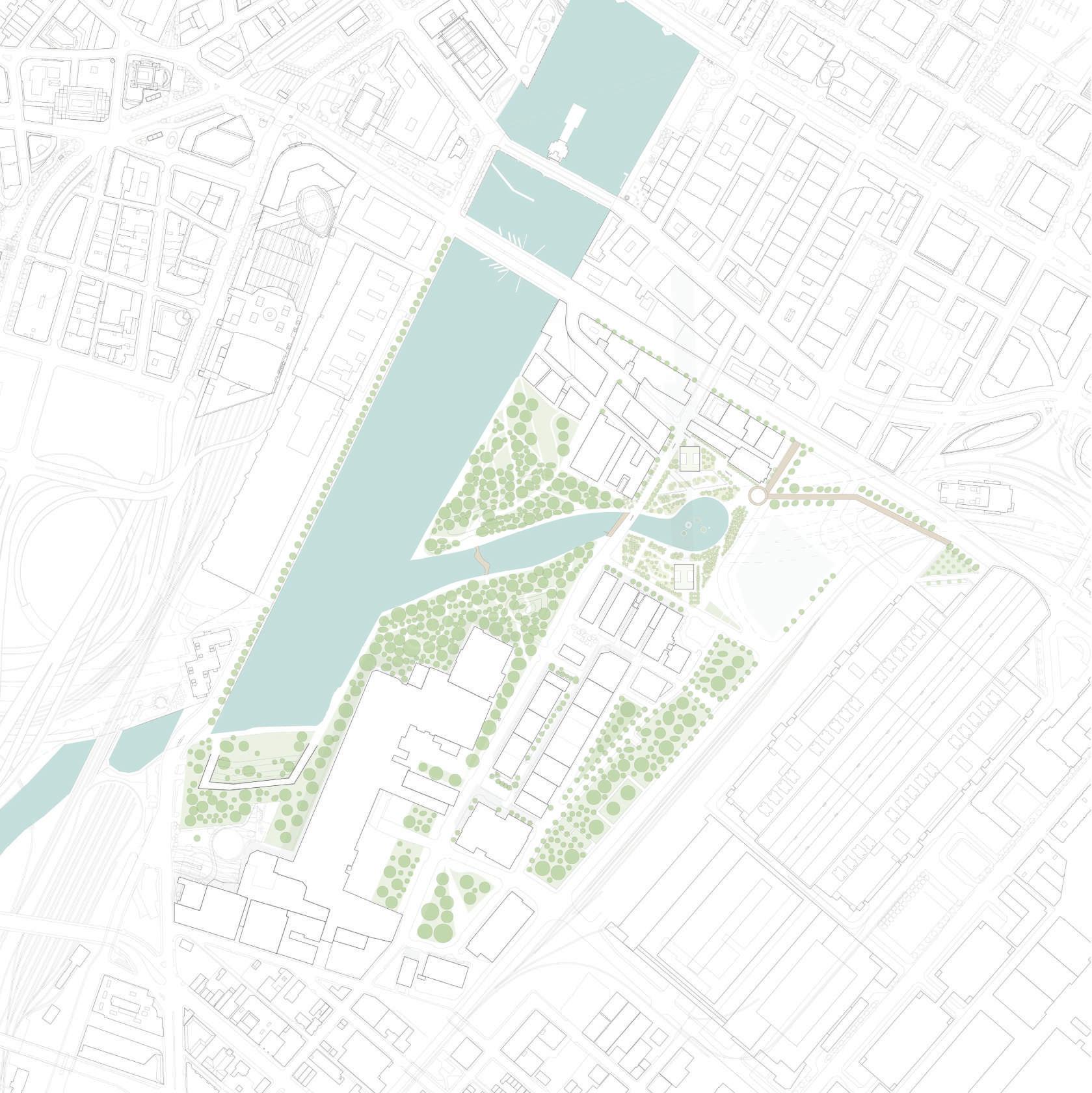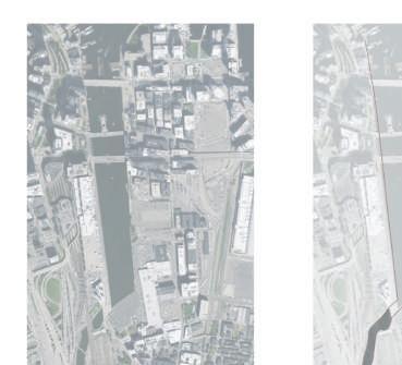 Sit e Plan: B y occupying a minimal foo t pr int , t he t ower s s t and out fr om t he surr ounding s t r uc t ur es, challenging t heir hor izon t al nat ur e while pr ov iding comparable squar e foo t age Addit ion all y, t hey cont r ibut e t o t he cr eat ion of a par k space, t rans for m ing t he Seapor t/For t Point Channel ar ea int o a landmar k t hat r epr esent s t he gr een f ut ur e of Bos t on.