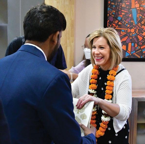 Kristen Waggoner greets an ADF India attorney at the India office, wearing a mala (garland) that symbolizes welcome and appreciation to guests.