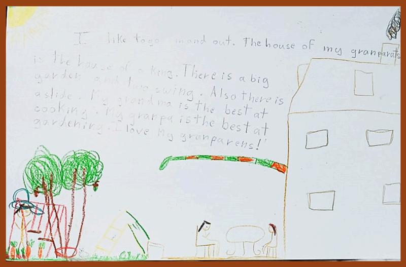I like to go in and out The house of my grandparents is the house of a king, There is a big garden and two swings Also there is a slide My grandama is the best at cooking My grandpa is the best at gardening