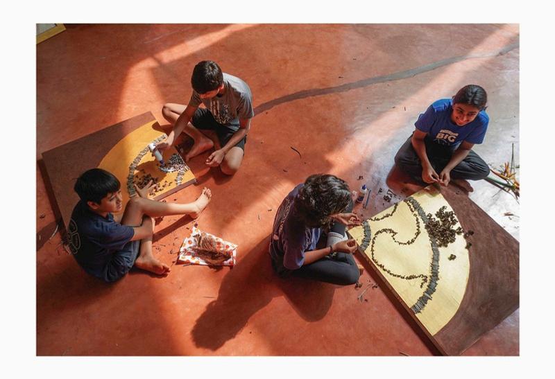 Our project with Aurodeva was to make art, but comprised entirely of nature. To start with, we made paint out of the rich red mud we have throughout auroville, mixing it with glue and altogether making a general mess. We covered the canvas generously, making sure to leave a golden circle in the center. We knew from the beginning that these works were going to be exhibited, so we tried (sort of) to meet these deadlines. We used all sorts of things that we foraged, such as bark, twigs, dried leaves, seedpods etc.