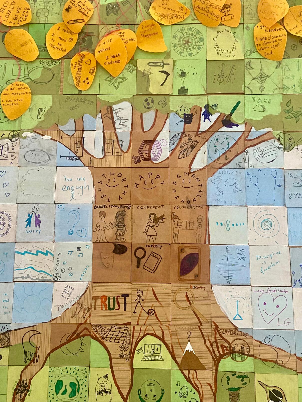 The tree was used as a symbol of interconnectedness: roots represent origins, bark signifies class agreements, leaves stand for diversity, and branches represent aspirations. Udayan felt especially connected with Auroville students, appreciating their openness and directness.