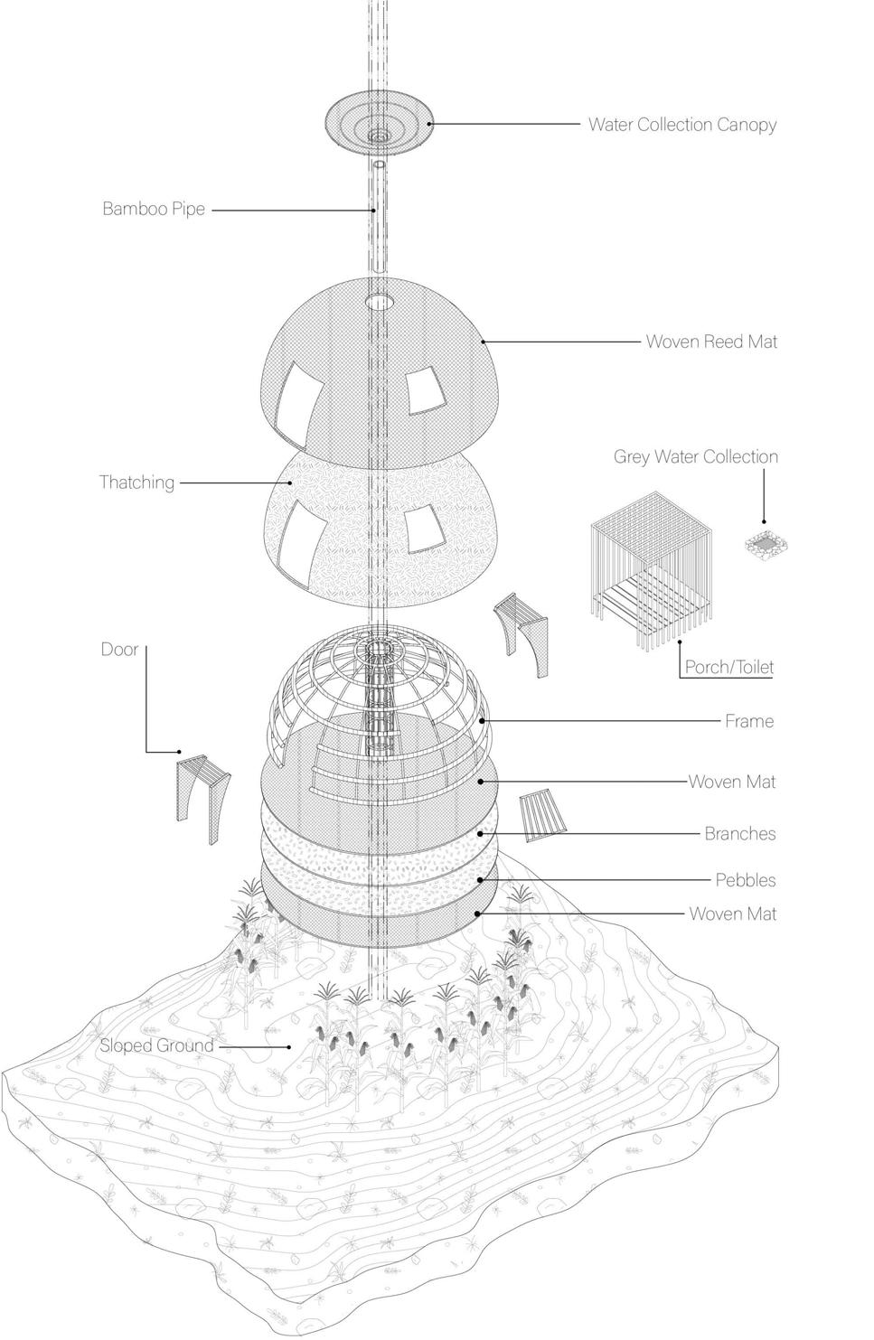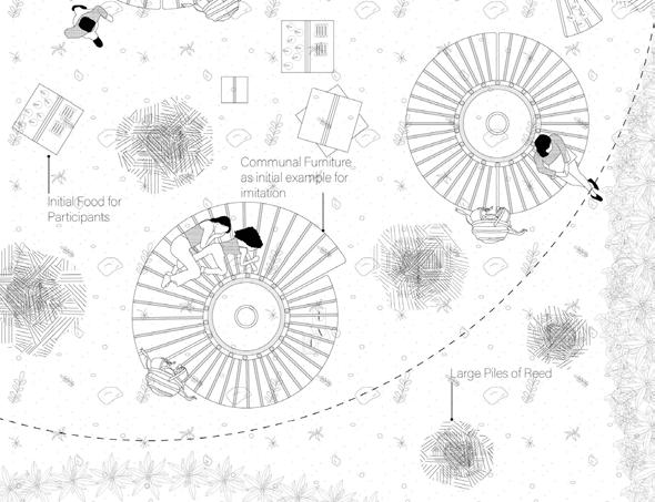 It begins with the first home module, which is inspired by local ecological knowledge from the traditional mudhif house of the Madan people from Southern Iraq. First, reed is gathered from nearby water sources; shorter reeds are bundled together to be used as beams, while larger pieces are uses for columns. These are semi-permanent homes, meaning the process would ideally be repeated every generation or 25 years.