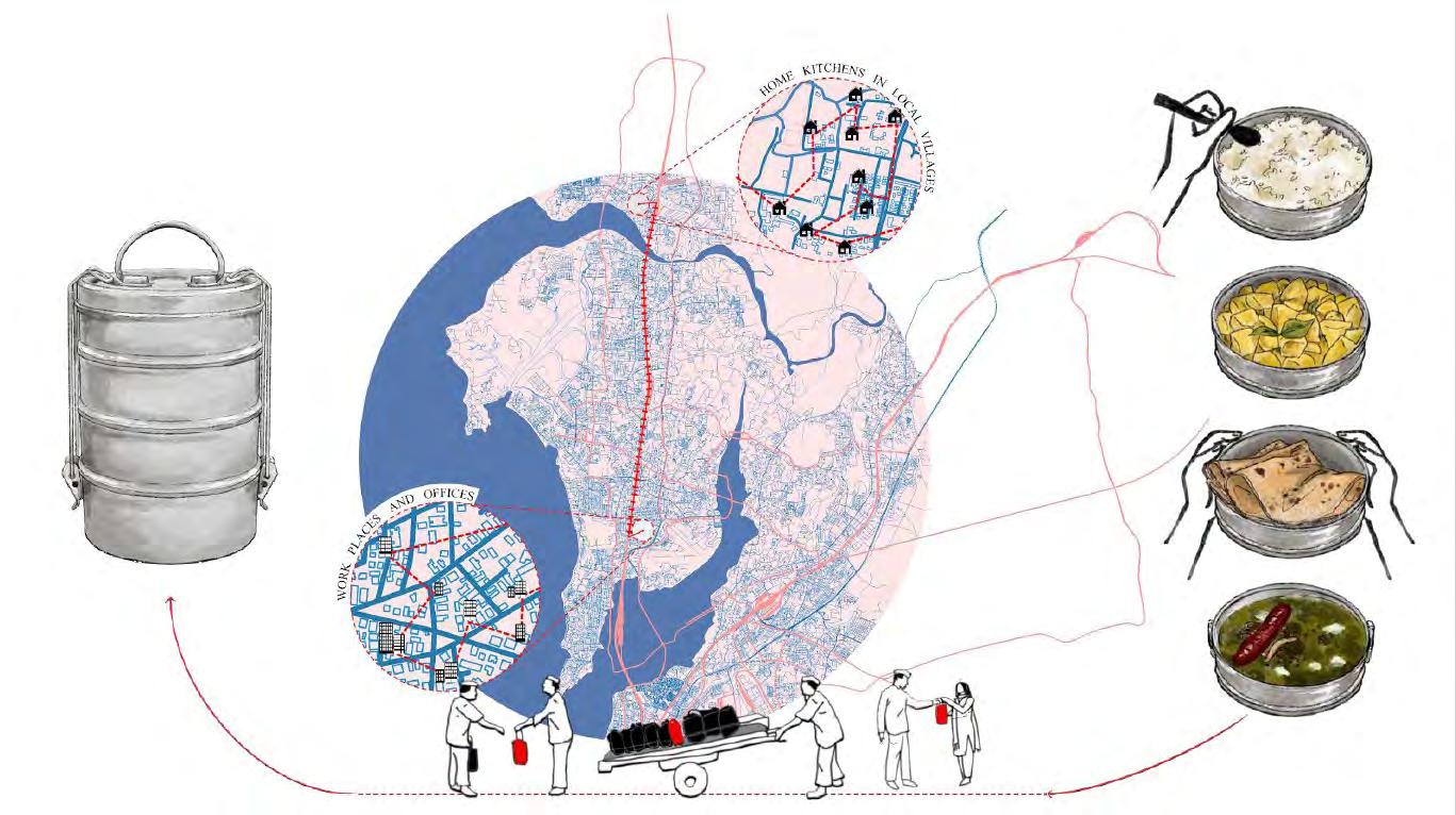 As a precedent for our experimental food-housing, we looked at the Dabawallas in Mumbai who deliver food from home kitchens in local villages to the city via messengers on trains and bicyles. This is a low cost system where the Dabawalla take pride in their service. Our current food delivery system relies on apps like Grubhub, Ubereats or Doordash, which, although fulfills the minimum, is expensive for all users of the app, both the consumer and the producer.