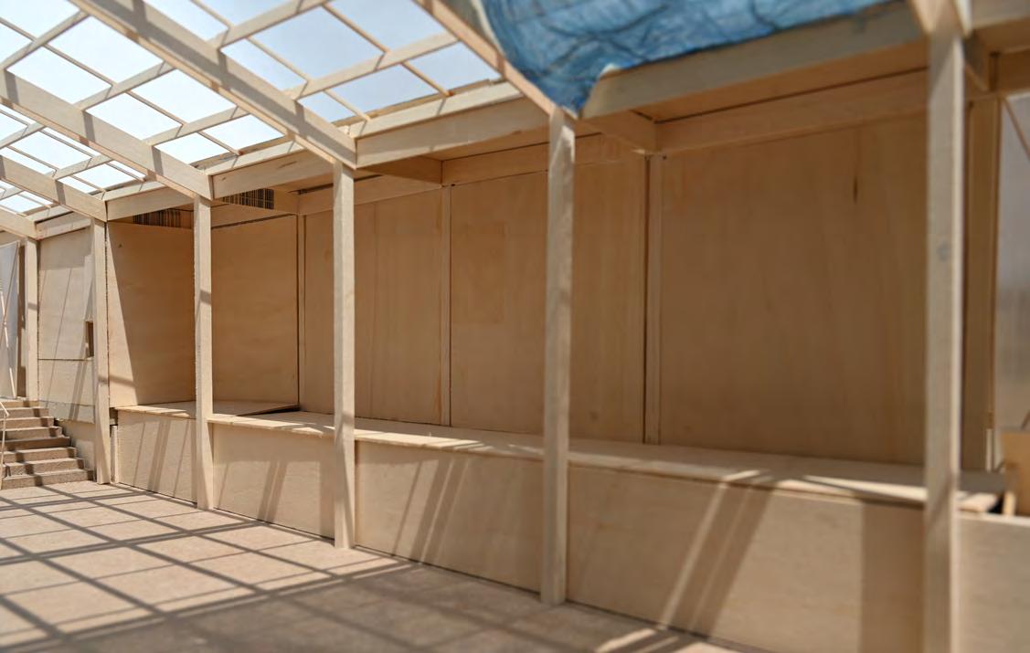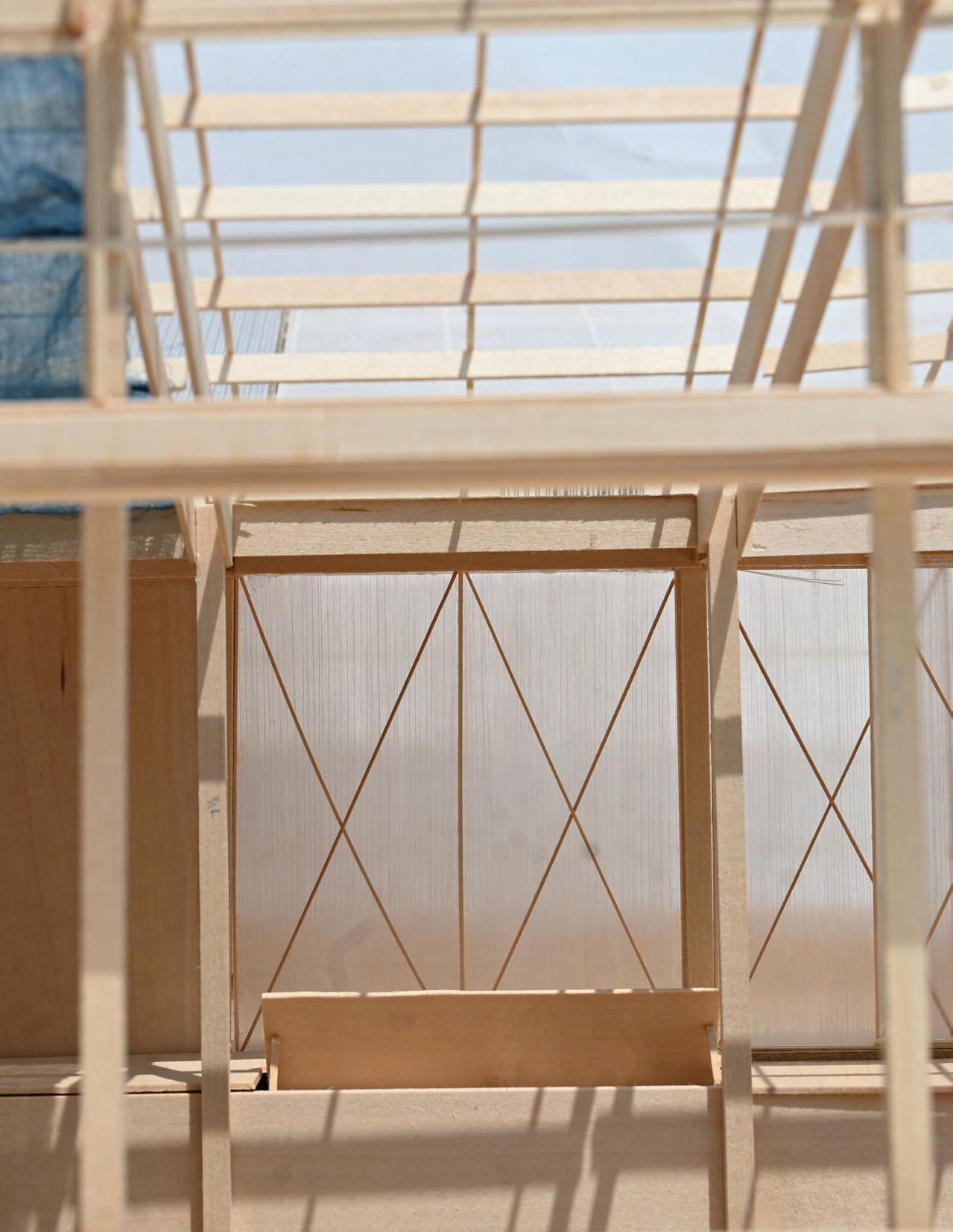 This is a 1:2 model particularly testing how to attach the beams to the columns, how the rafters would join together at the seams, and how to build up the roof framing in order to accomodate for the box gutter.