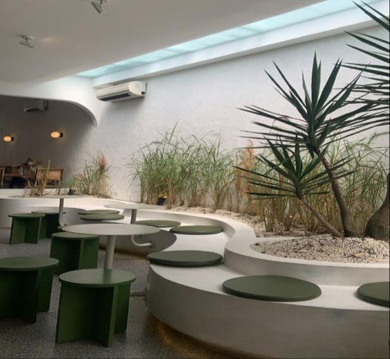 The structure itself incorporates the organic and natural aspect as timber woods are used as a material for the interior structure as well as plant which bring the environment indoors and creates a more positive space .