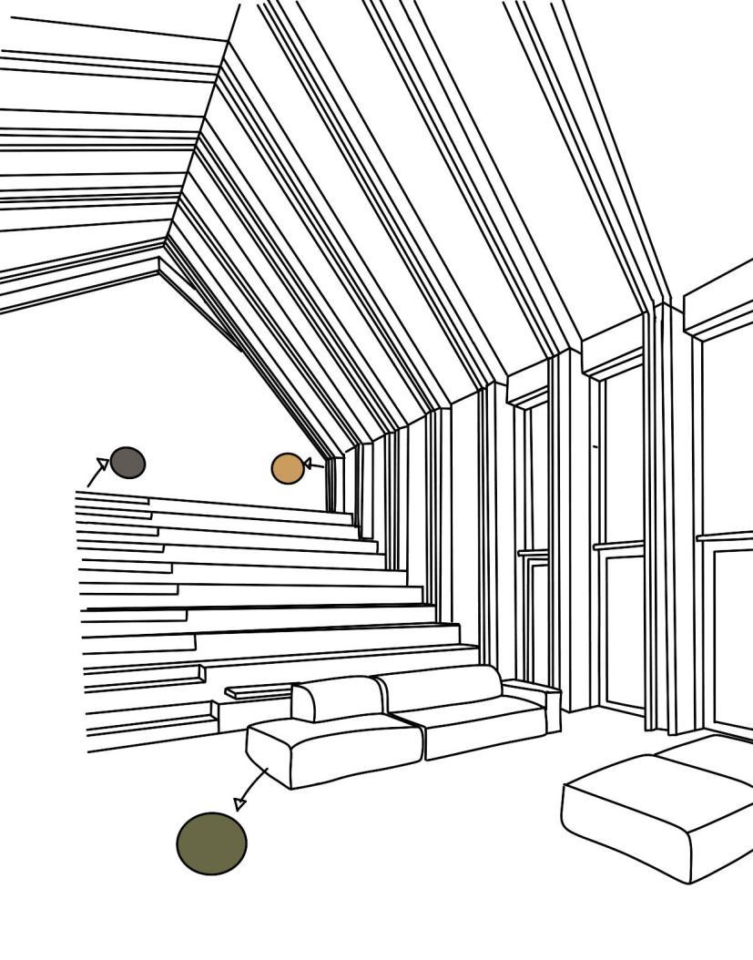 The theme of the community centre is organic and natural as can be seen with timber wood used as the main structure material and mutual colours to make the space more welcoming and natural by using greens and greys