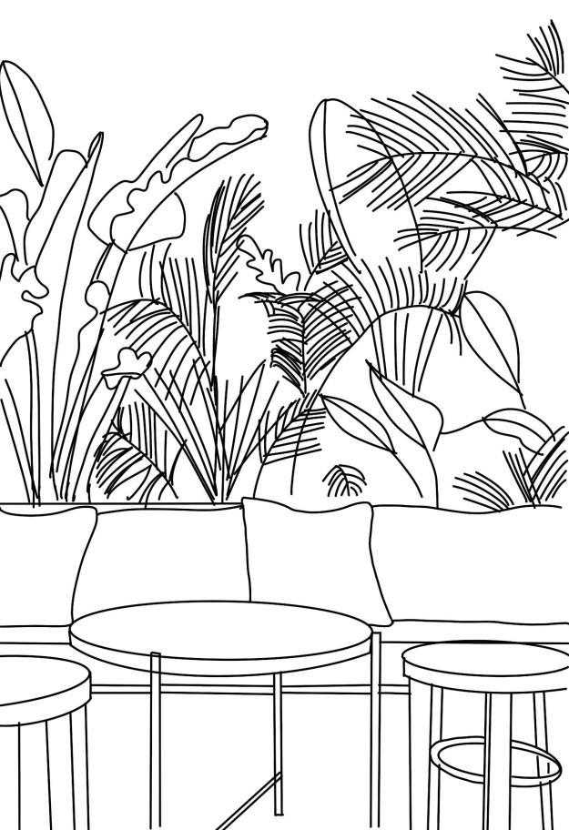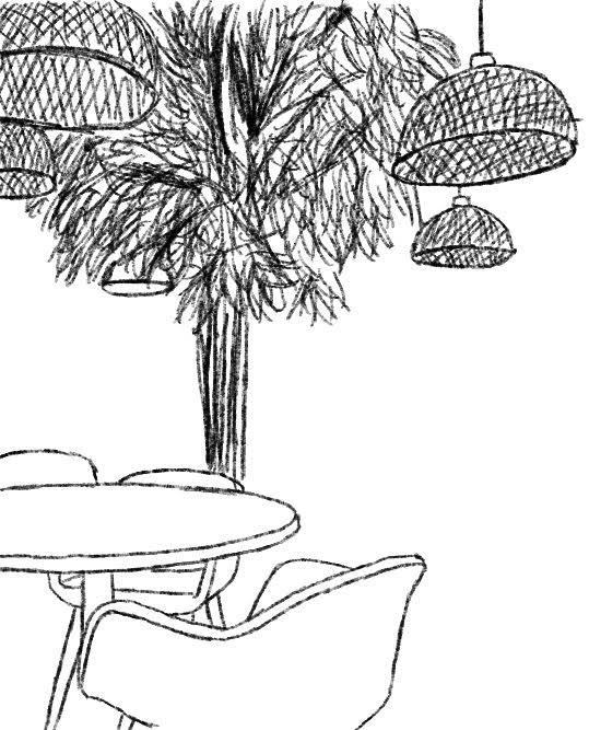The interior incorporates the outdoor environment by including a natural colour scheme as well as nature with trees and plants. The interior includes light colours such as pastel pink , greens and shades or grays that creates a relaxing atmosphere and promotes a better well being . People can truly relax and enjoy them selves when surrounded my nature and can eat and talk with family and friends and overall enjoy their time