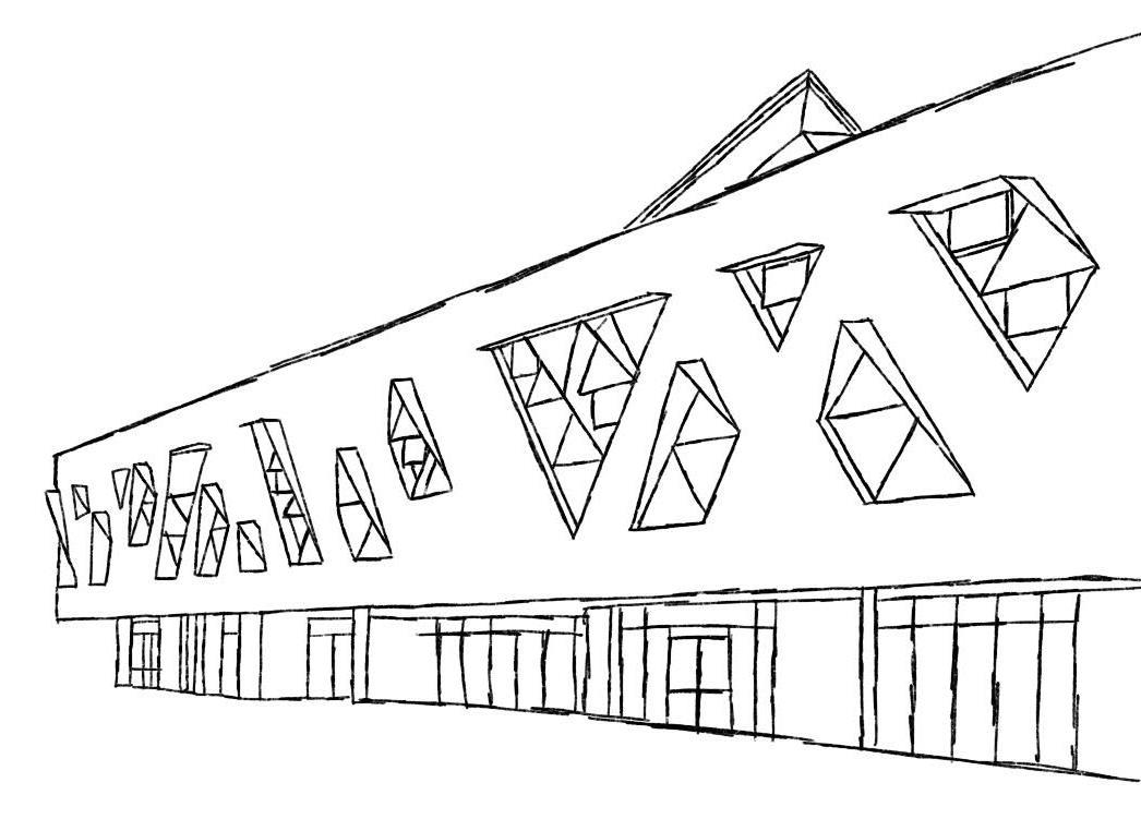 The building is seen as very much different as it doesn’t use normal rectangular windows but geometric triangle windows instead which creates a different space , furthermore the main building still uses the same geometric like building with three sided shapes . The community center consists of three different main parts; an auditorium , a music rehearsal room a fire department and a town hall. Theses therefor all represents how many uses a space can have . It therefore gives the community center multiple uses .