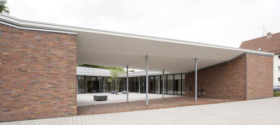 The central space of the new building is a courtyard that is framed on three sides, which opens to the south and hence formulates an inviting gesture. The slight twisting of the floor plan from the given order refers to the church and opens a dialogue with the spiritual gathering place of the congregation. The clear shape of the floor plan and the sculptural roof landscape makes the community center a strong solitaire in the wide urban space of the Mallinckrodtplatz. It uses the stage given to demonstrate its importance in the urban realm as a place of the community next to its large Neighbours the church and the hospital.