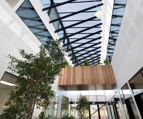 The glass panels also allows access to extra lighting . It also has a courtyard locate din the middle where the class panels surround it allowing nature to be within the building encouraging habitats and animals to come .