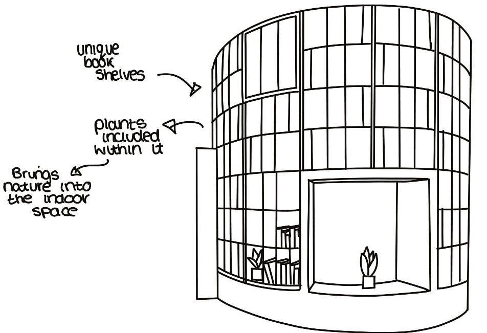 The space Is also sustainable as plants are used which can help with mental health and make people more relaxed especially in a library also the use of mutual colors