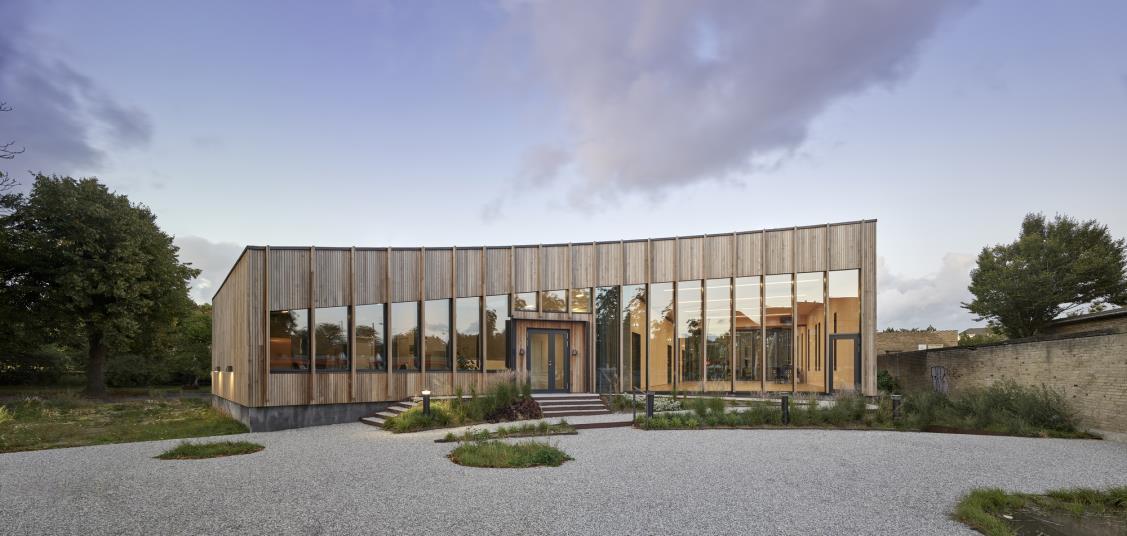 The curved walls of the building embrace the urban space, open up towards the garden and create a sensitive meeting with the neighboring rectory. The exterior cladding in ash wood creates a warm ambiance that signals the informal use of the parish center as a community with diverse users and activities.