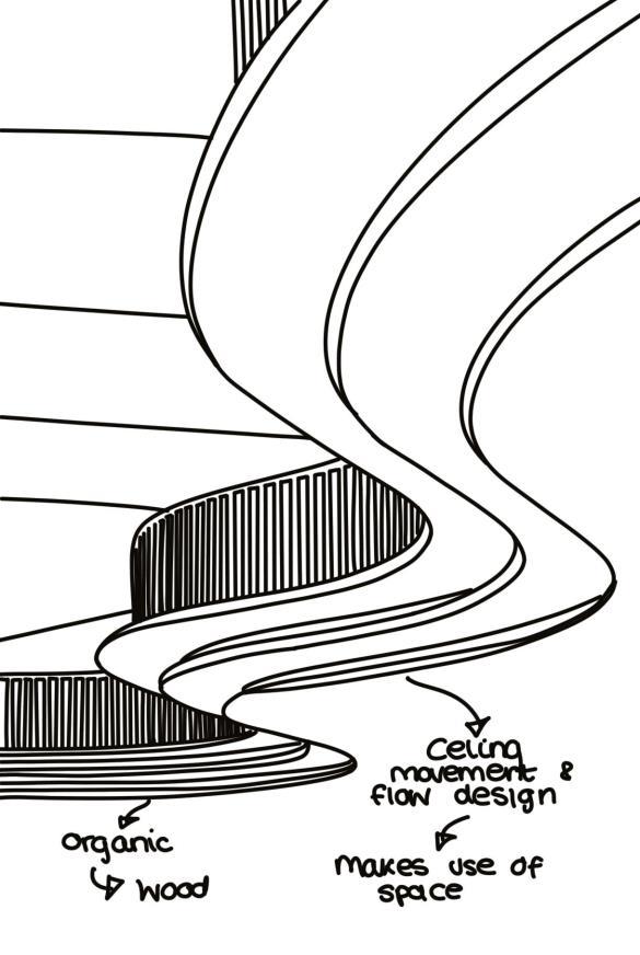 Timber wood adds details and texture to the space as well as being sustainable and breathable allowing a natural source of ventilation with plants included. Curved edges are also key including dome entrances as it blends in with nature giving a unique feel with curvy natural infrastructures. Furthermore, linking curved furniture also links to the look and aura of a space as its sooths well beings of pedestrians giving a positive vibe in all.