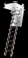 The LMP model is a metal, three section, folding attic ladder designed for high ceilings, up to 12ft. It contains an unloading mechanism hidden in the handrail that supports the folding and unfolding of the ladder.