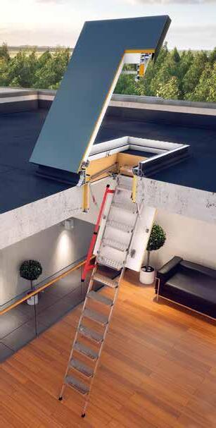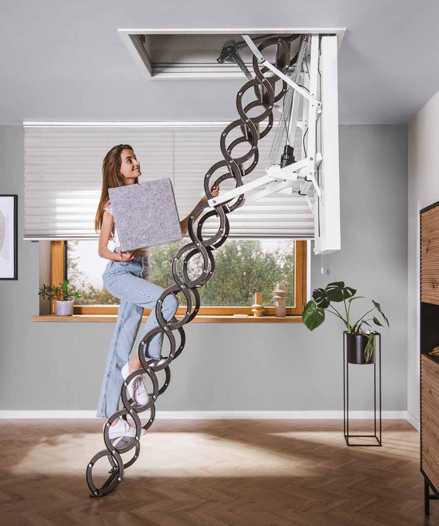 The LET Electric Attic Ladder is FAKRO’s first electrically controlled attic ladder and a nextgeneration model focused on convenience. It operates via a Z-Wave control kit and also includes a standard wall switch. The ladder provides excellent thermal insulation and a clean, modern appearance. It uses a scissor-style steel ladder and ships with a quick-assembly kit for efficient installation.