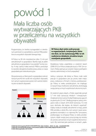 powód 1 Mała liczba osób wytwarzających PKB w przeliczeniu na wszystkich obywateli Przypomnijmy, że średnia wynagrodzeń w określonym państwie to w przybliżeniu wartość PKB podzielona na wszystkich obywateli danego kraju. W Polsce na 38 mln mieszkańców tylko 13 mln jest zatrudnionych w gospodarce. Wynika stąd, że jeden zatrudniony w gospodarce musi „zarobić” na trzy osoby. A więc oprócz małej wartości PKB/os. powoduje to wysokie obciążenia kosztów pracy, przez co nasza gospodarka jest niekonkurencyjna. Dla porównania, w Niemczech w gospodarce zatrudnionych jest 40 mln na 80 mln wszystkich obywateli, tym samym wypracowana przez nich wartość dzielona jest na dwóch obywateli.