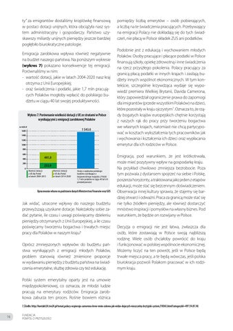ty” za emigrantów dostaliśmy kroplówkę finansową w postaci dotacji unijnych, która obciążyła nasz system administracyjny i gospodarczy. Państwo uzyskawszy miliardy unijnych pieniędzy jeszcze bardziej pogłębiło biurokratyczne patologie. Emigracja zarobkowa wpływa również negatywnie na budżet naszego państwa. Na poniższym wykresie (wykres 7) pokazano konsekwencje tej emigracji. Porównaliśmy w nim: - wartość dotacji, jakie w latach 2004-2020 nasz kraj otrzyma z Unii Europejskiej; - oraz świadczenia i podatki, jakie 1,7 mln pracujących Polaków mogłoby wpłacić do polskiego budżetu w ciągu 40 lat swojej produktywności. Wykres 7. Porównanie wielkości dotacji z UE ze stratami w Polsce wynikającymi z emigracji zarobkowej Polaków w mld zł